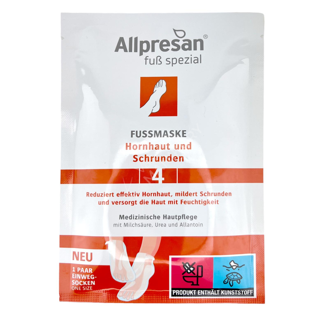 Zrohovatělá a popraskaná pokožka může být velmi hrubá a odolná. Speciální maska na nohy Allpresan č. 4 byla vyvinuta pro rychlé snížení tvorby hrubé pokožky. Kyselina mléčná a urea redukují tvorbu zrohovatělé pokožky, zatímco vilín a alantoin zklidňují a vyživují pokožku. Hrubá pokožka a praskliny jsou rychle a účinně redukovány a pokožka je prokazatelně hydratovaná. Výsledkem po použití jsou hladká a hebká chodidla.
