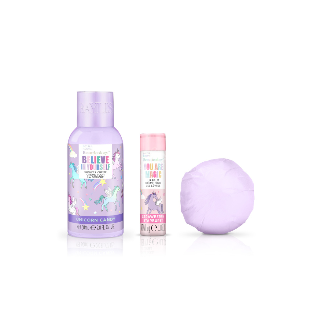 Nádherná dárková sada ve třpytivém pouzdře s jednorožcem obsahuje sprchový krém, balzám na rty a šumivou bombu do koupele ve dvou sladkých vůních, jako z cukrárny.