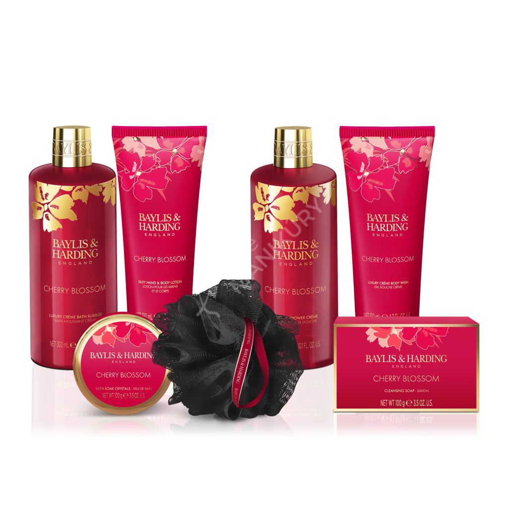Luxusní dárková sada obsahuje sprchový krém, tělové mléko, tuhé mýdlo, mléko do koupele, sprchový gel, a krystalky do koupele s nádhernou ženskou vůní třešňových květů. A k tomu koupelovou houbičku.