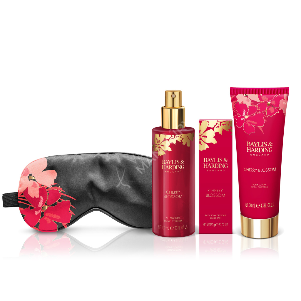 Luxusní dárková sada obsahuje sprej na polštář, tělové mléko a sůl do koupele s nádhernou ženskou vůní třešňových květů. A k tomu měkkou, pohodlnou masku na oči.