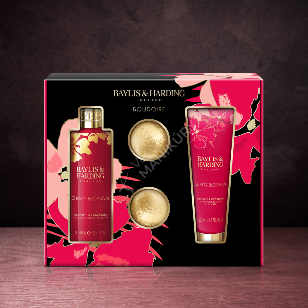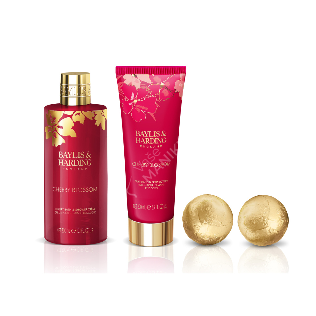 Luxusní dárková sada obsahuje sprchový krém, tělové mléko a dvě šumivé koule s nádhernou ženskou vůní třešňových květů. A k tomu koupelovou houbičku.