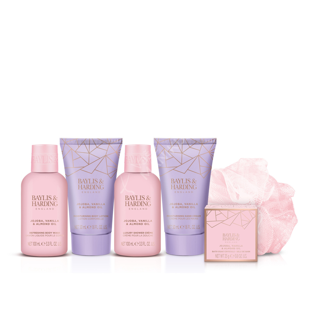 Luxusní dárková sada obsahuje sprchový krém, tělové mléko, tuhé mýdlo, sprchový gel, a krystalky do koupele s lehkou a jemnou vůní jojoby a vanilky s nádechem mandlí. A k tomu tělovou houbičku.