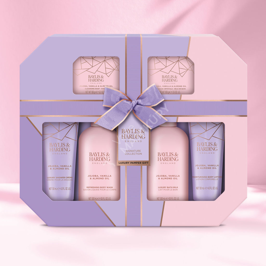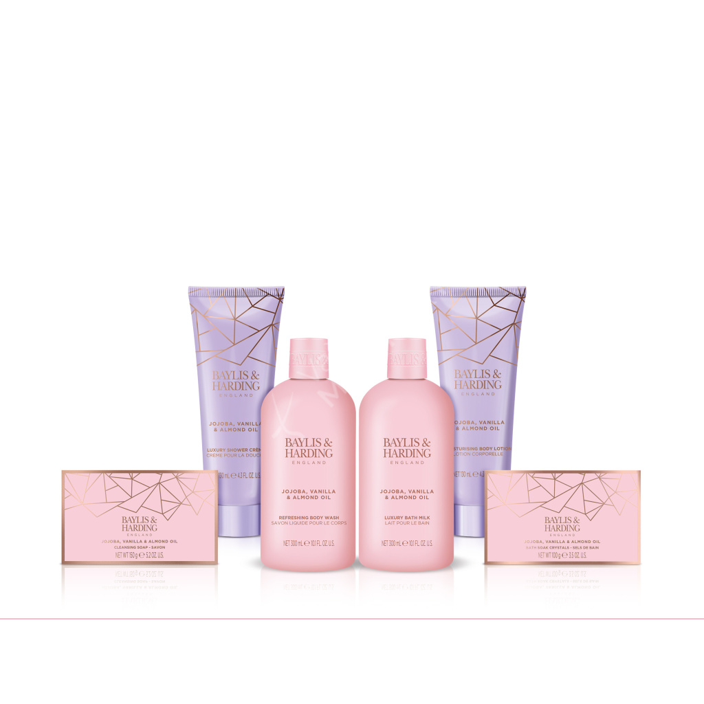 Luxusní dárková sada obsahuje sprchový krém, tělové mléko, tuhé mýdlo, sprchový gel, mléko do koupele a krystalky do koupele s lehkou a jemnou vůní jojoby a vanilky s nádechem mandlí.