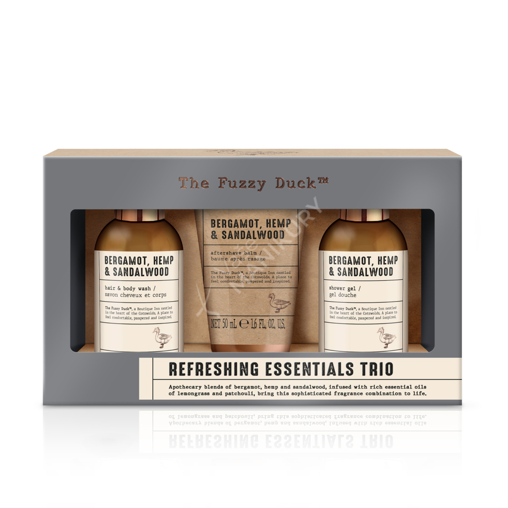 Dárková sada obsahuje energizující balzám po holení, mycí gel 2v1 na tělo a vlasy a sprchový gel s mužnou vůní bergamotu, konopí a santalového dřeva.