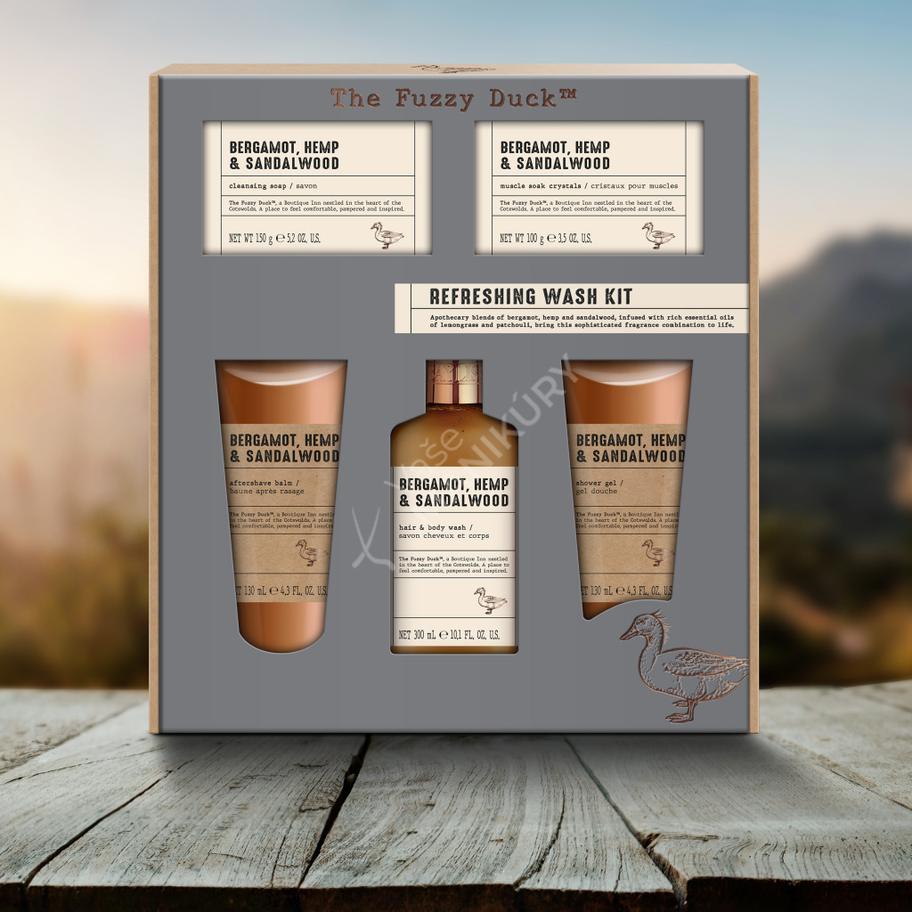 Luxusní pánská dárková sada obsahuje sprchový gel, balzám po holení, mycí gel 2v1 na tělo a vlasy, tuhé mýdlo, pleťový mycí gel a krystalky do koupele s mužnou vůní bergamotu, konopí a santalového dřeva.