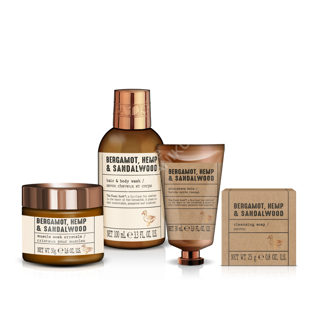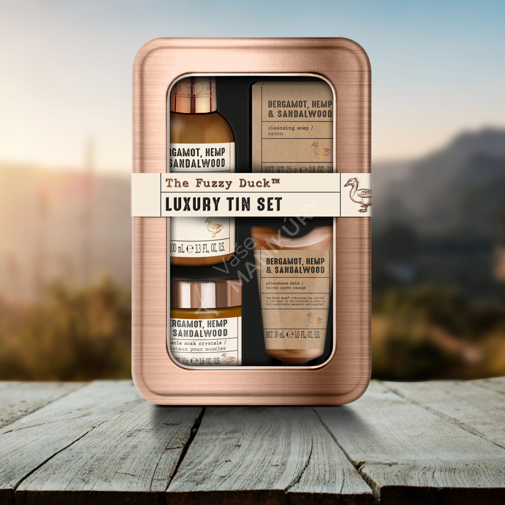 Luxusní dárková sada péče o tělo obsahuje mycí gel 2v1, koupelové krystalky, balzám po holení, tuhé mýdlo 25g s mužnou vůní bergamotu, konopí a santalového dřeva.