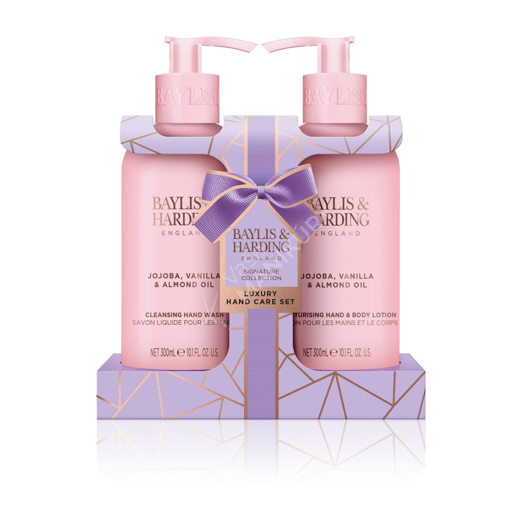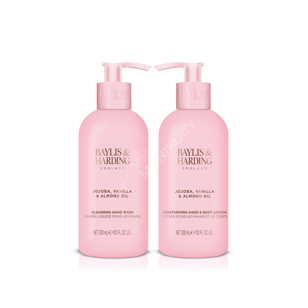 Dárková sada péče o ruce obsahuje tekuté mýdlo a mléko na ruce a tělo s lehkou a jemnou vůní jojoby a vanilky s nádechem mandlí.