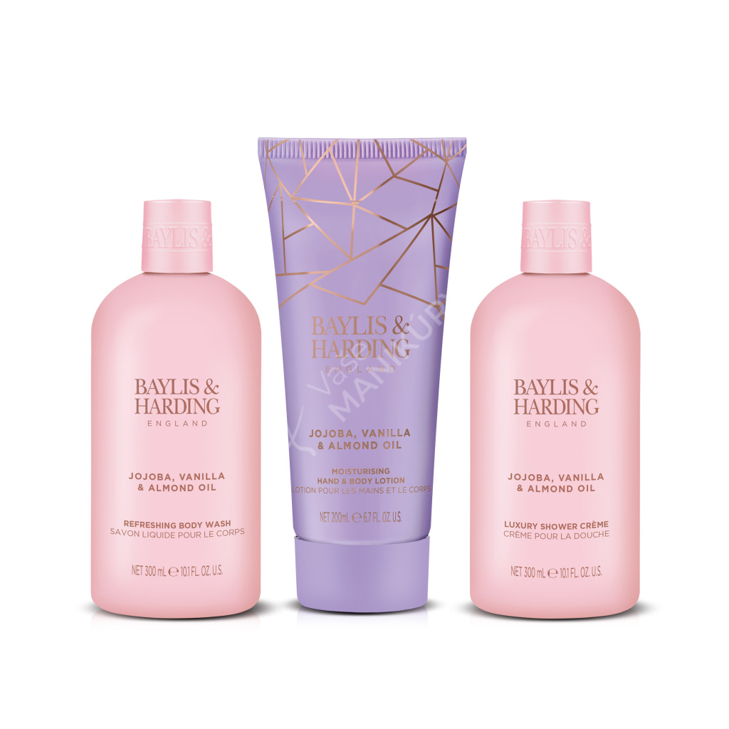 Luxusní dárková sada obsahuje sprchový krém, tělové mléko a sprchový gel s lehkou a jemnou vůní jojoby a vanilky s nádechem mandlí.
