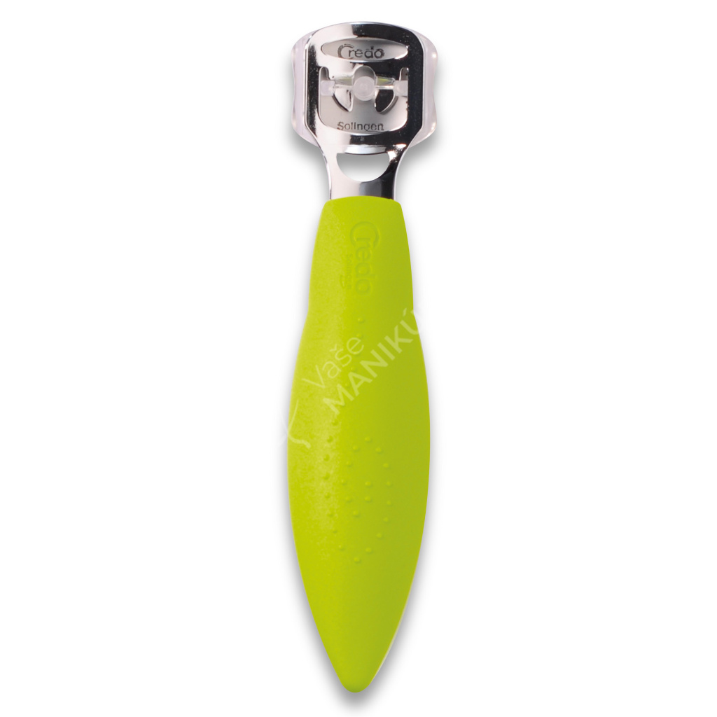 Bezpečnostní seřezávač zrohovatělé kůže německé značky Credo Solingen v zelené barvě.
