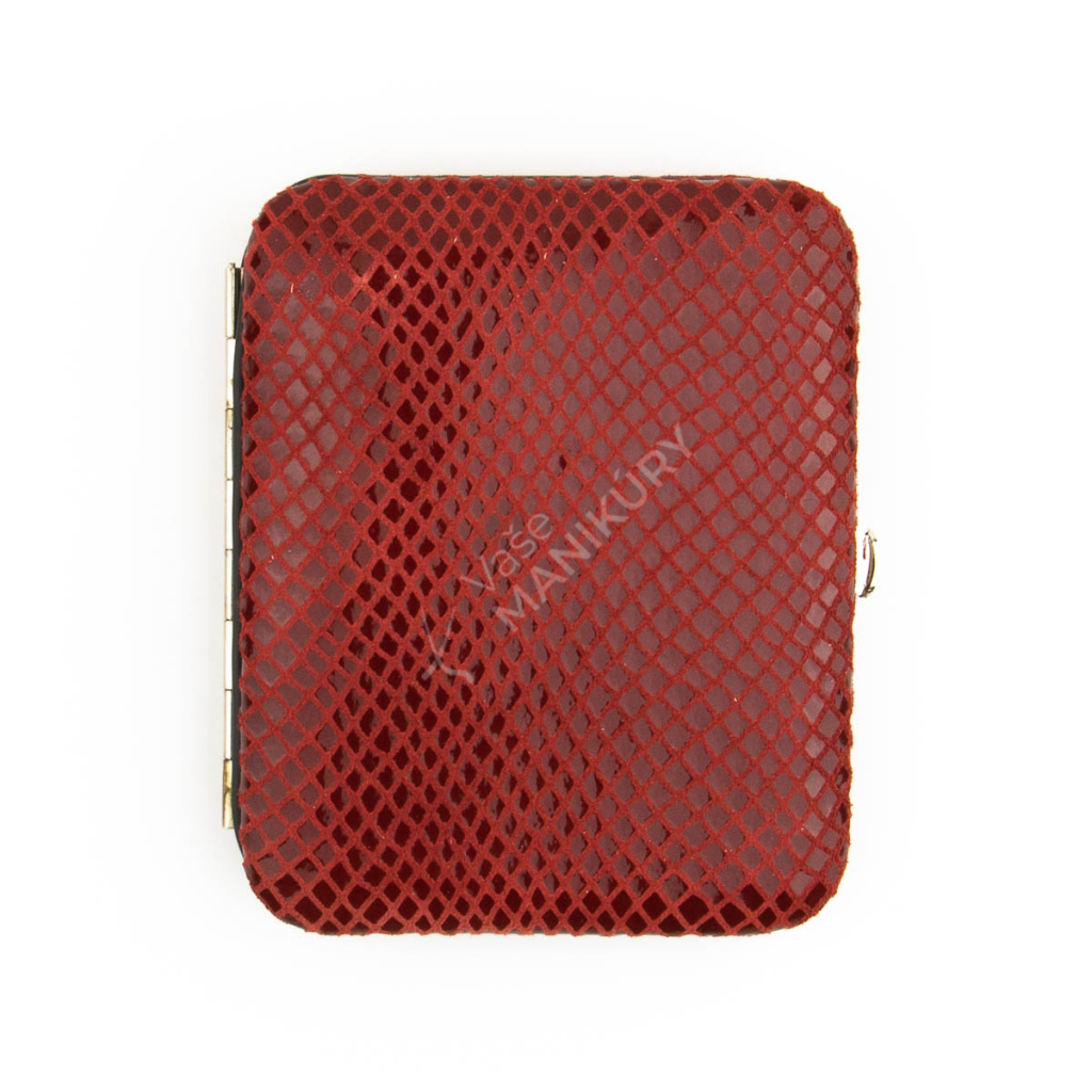 Menší pouzdro na manikúruje v příjemné červené barvě je vyrobeno z pravé kůže a upraveno do vzhledu hadí kůže.