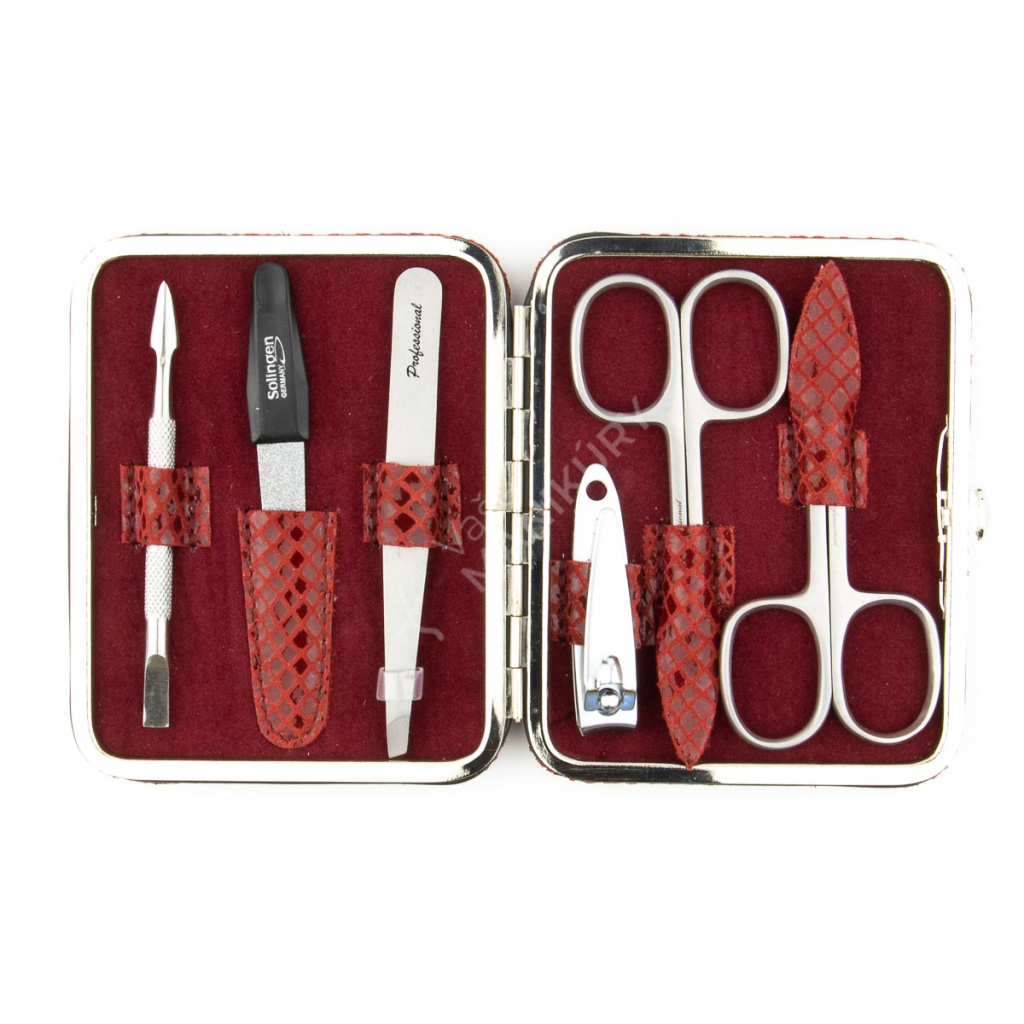 Menší dámská 6dílná sada na manikúru s kvalitními nerezovými nástroji v koženém pouzdru se vzorem hadí kůže.