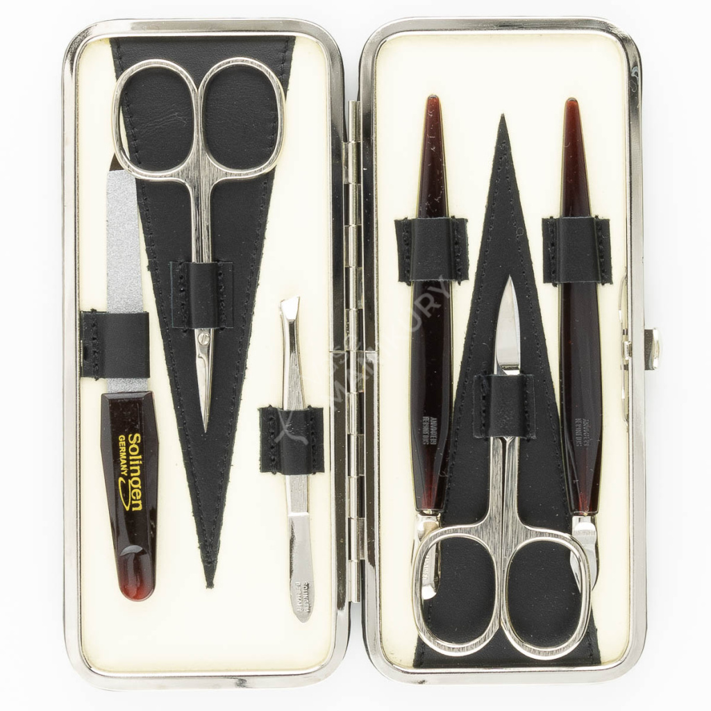 Krásná sada na manikúru pro ženy z přírodní kůže je vybavena prvotřídními nástroji Solingen z kvalitní poniklované oceli. Výrobky Solingen jsou proslulé špičkovým zpracováním a dlouhou životností. Nástroje jsou přehledně uloženy v koženém pouzdru v černé barvě. Pouzdro je pevné a praktická velikost této 6-dílné sady se hodí i na cesty a nemusíte se obávat, že některý díl z této sady ztratíte