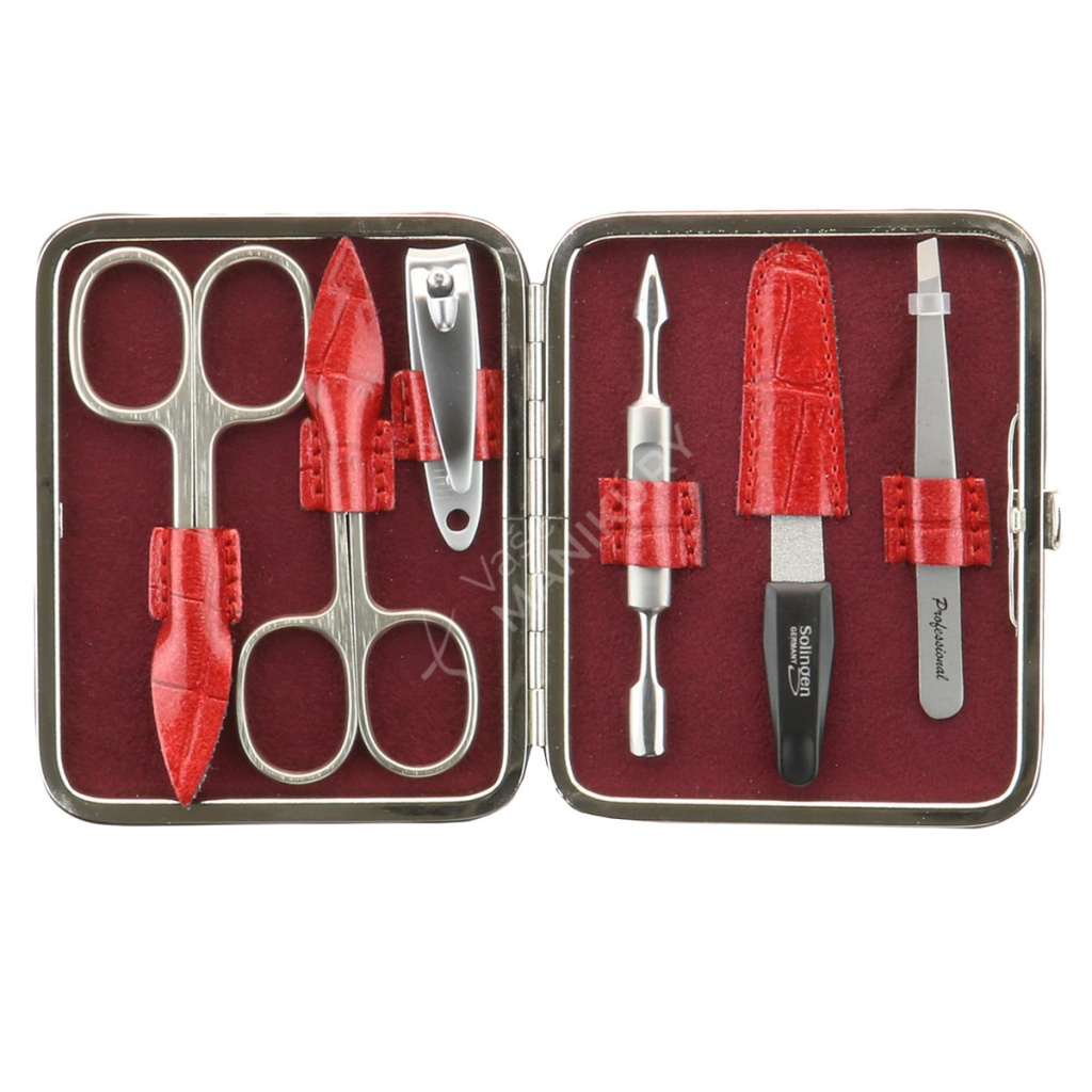 Menší dámská 6dílná sada na manikúru s nůžkami a pilníkem Solingen v krásném červeném pouzdru.
