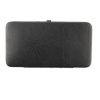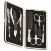 Pouzdro s pevným kovovým rámem je vyrobeno z přírodní hovězí kůže v černé barvě. Vnitřní strana pouzdra je také z kůže. Hladká kůže je velmi atraktivní a příjemná na dotek. Dvoudílné pouzdro se snadno otevírá. Rám je z lesklé pochromované oceli. V pouzdru najdete sedm manikúrních nástrojů z prvotřídní poniklované oceli od německého výrobce manikúr Erbe Solingen, které jsou velmi odolné proti opotřebení. A protože jsou vyrobeny z vysoce kvalitní oceli, zůstávají i neuvěřitelně dlouho ostré.