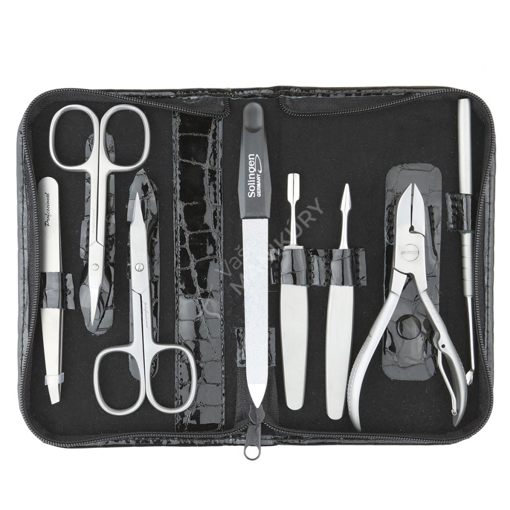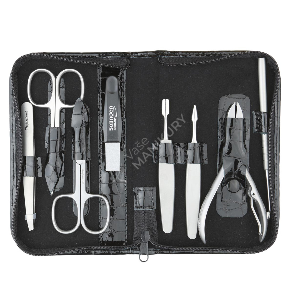 Bohatě vybavená 8dílná sada na manikúru s nerezovými nástroji a pilníkem Solingen černém pouzdru z přírodní kůže.
