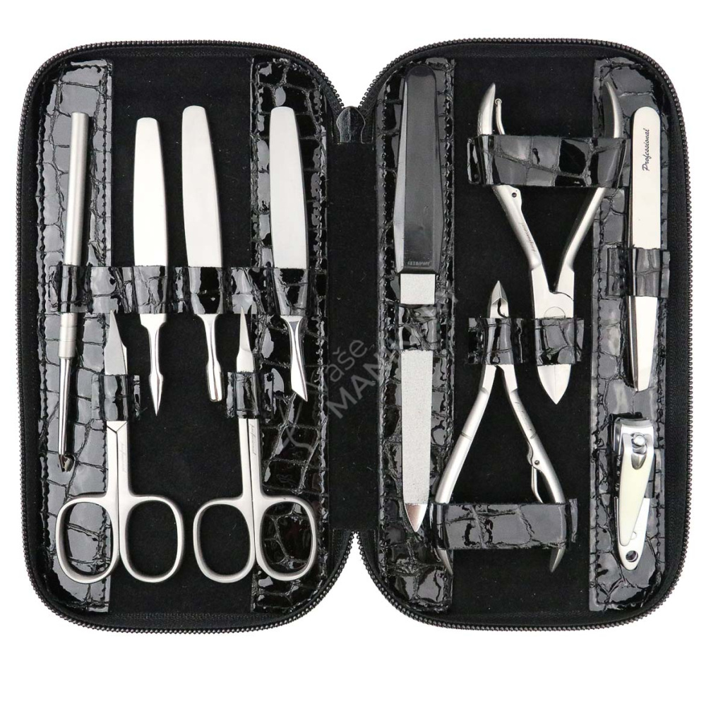 Tato bohatě vybavená sada na manikúru a pedikúru bude vašim skvělým pomocníkem při domácí manikúře. Všechny nástroje jsou přehledně uloženy v elegantním pouzdře. Krásné pouzdro na zip je vyrobeno z pravé kůže v černé barvě a je upraveno do vzhledu krokodýlí kůže