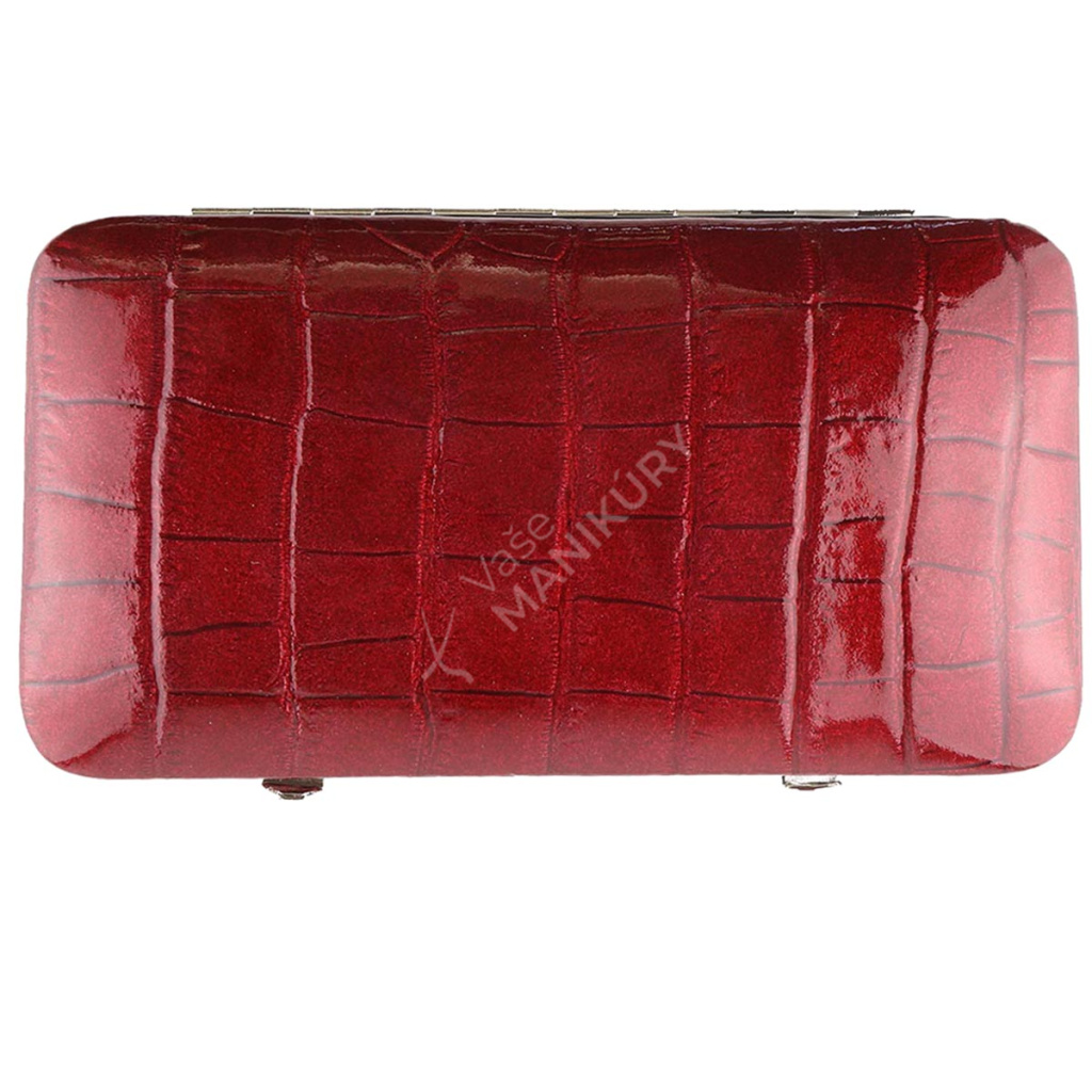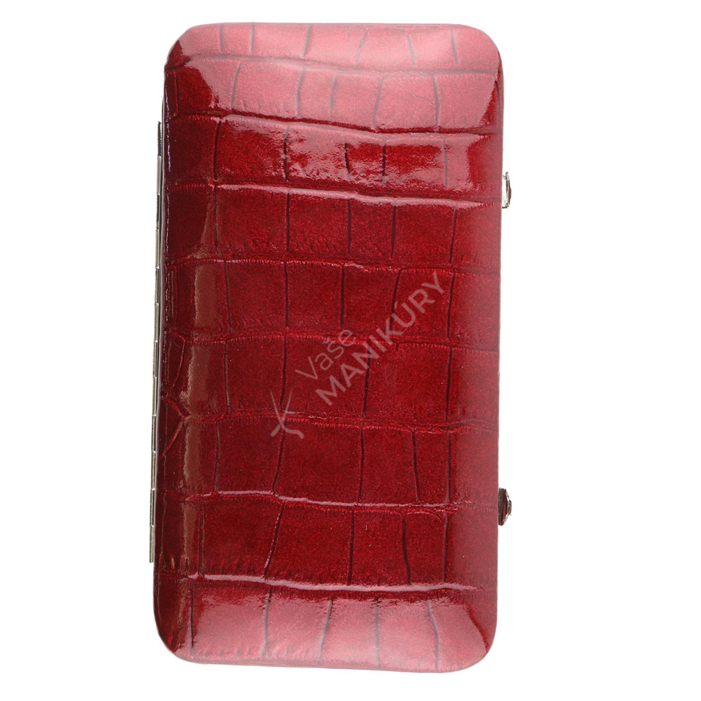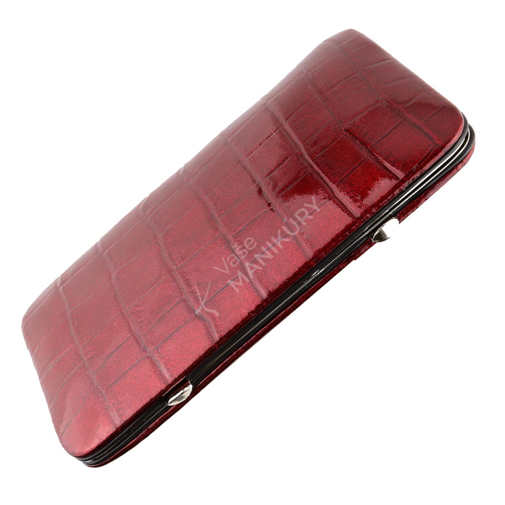 Krásné pouzdro s kovovým rámem je vyrobeno z pravé kůže v sytě červené barvě a je upraveno do vzhledu krokodýlí kůže. Dvoudílný ocelový pochromovaný rám umožňuje pohodlné a spolehlivé otevírání manikúry. Látka na vnitřní straně pouzdra je na povrchu sametová, jemná a velmi příjemná na dotek.