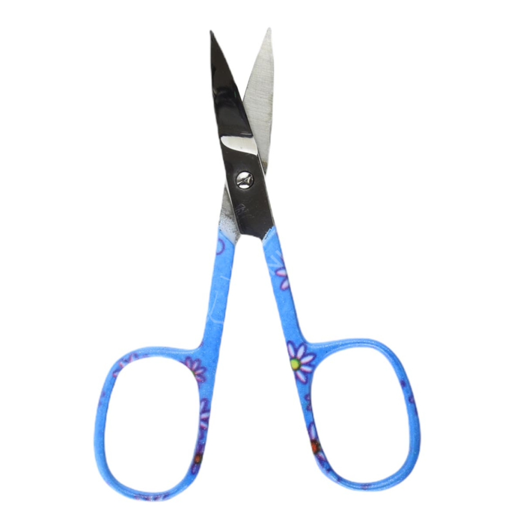 Modré barevné nůžky pro děti se vzorem kytiček.