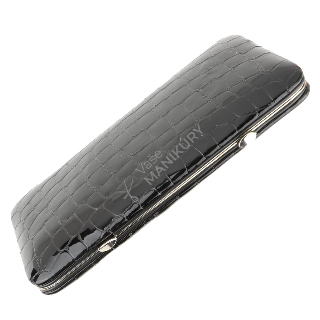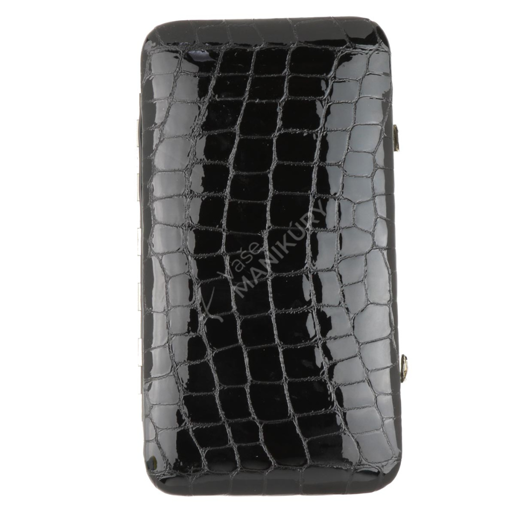 Krásné pouzdro s kovovým rámem je vyrobeno z pravé kůže v černé barvě a upraveno do vzhledu krokodýlí kůže. Dvoudílný ocelový pochromovaný rám umožňuje pohodlné a spolehlivé otevírání manikúry. Látka na vnitřní straně pouzdra je na povrchu sametová, jemná a velmi příjemná na dotek.