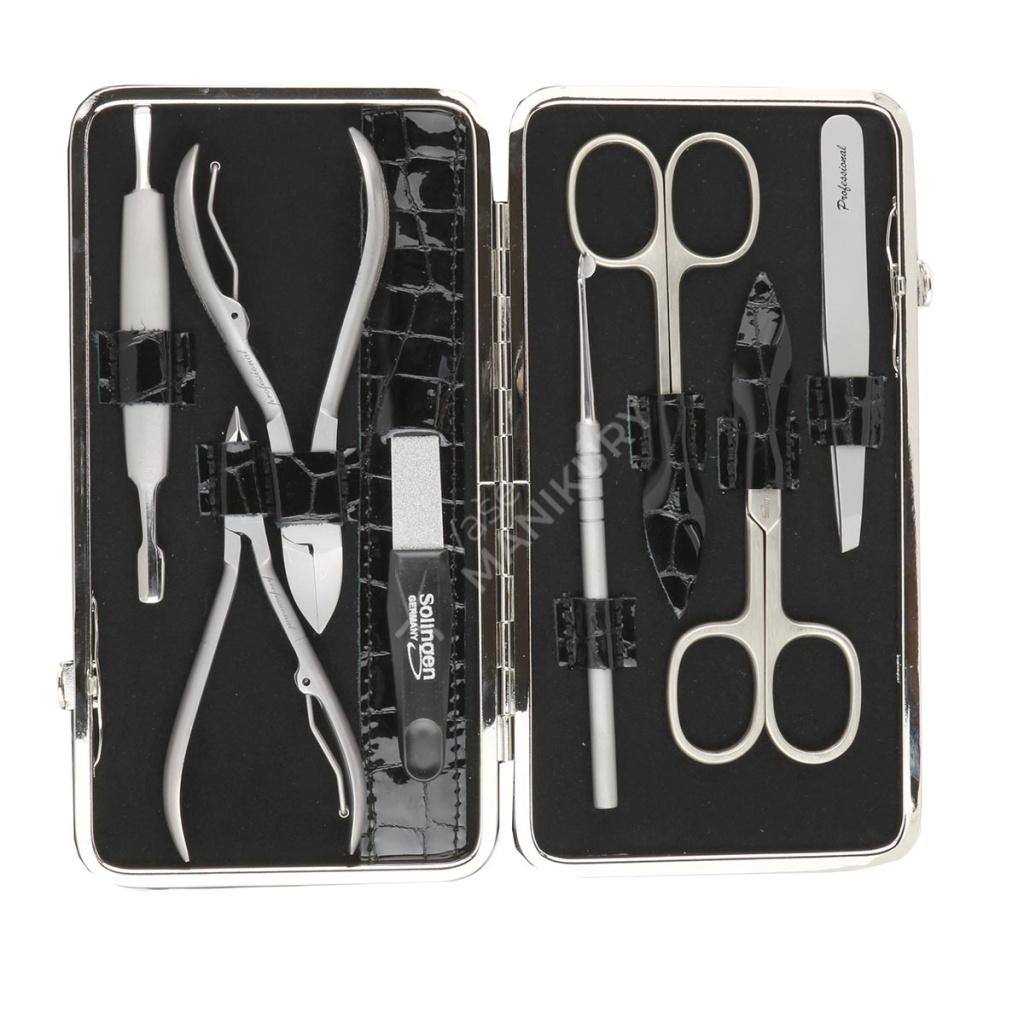 Manikúra vás ale nezaujme jen svým elegantním nadčasovým vzhledem, ale i praktickou vnitřní výbavou. Uvnitř je přehledně uloženo osm nástrojů na úpravu nehtů - nůžky a safírový pilník Solingen a další manikúrní nástroje řady Professional z oceli v matové úpravě. Nůžky jsou z kvalitní poniklované oceli. Tato sada na manikúru bude vašim pomocníkem při domácí péči a pomůže vám udržovat krásný vzhled vašich rukou.