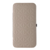 Elegantní béžová dámská sada na manikúru v pouzdru s pevným kovovým rámem ze syntetické kůže. Dvoudílné pouzdro se snadno otevírá. Rám je z lesklé pochromované oceli.