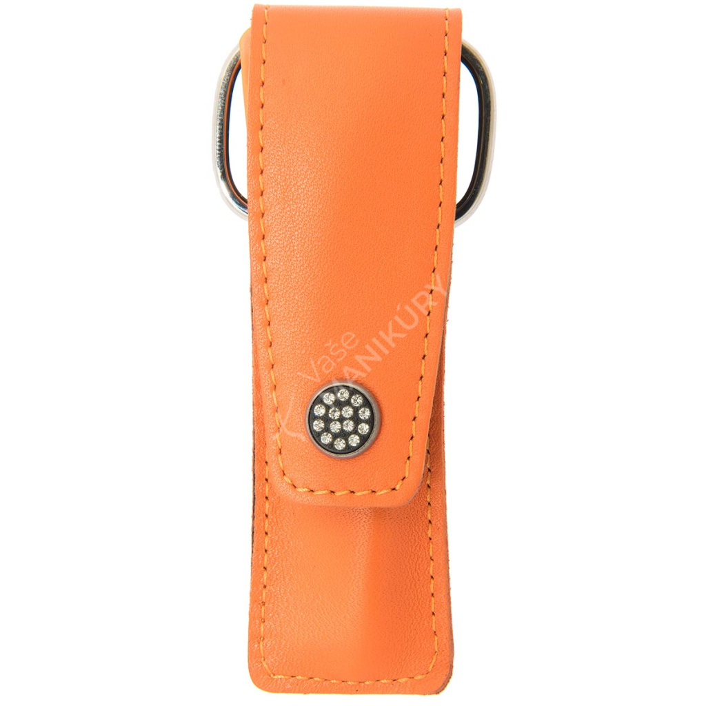 Pouzdro s klopnou se zavíráním na patent je vyrobeno z přírodní hovězí kůže v oranžové barvě. Patent je ozdoben kamínky a působí jako výrazný okrasný prvek. Hladká pravá kůže je příjemná na dotek.V pouzdru najdete tři základní manikúrní nástroje z prvotřídní poniklované oceli od německé značky GöSol Solingen, které jsou velmi odolné proti opotřebení. A protože jsou vyrobeny z vysoce kvalitní oceli, zůstávají i neuvěřitelně dlouho ostré.