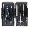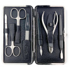 Černá luxusní dámská sada na manikúru v pouzdru s pevným kovovým rámem z přírodní hovězí kůže. Kůže je velmi jemná a příjemná na dotek. Z pravé kůže je rovněž i vnitřní strana pouzdra. Dvoudílné pouzdro se snadno otevírá. Rám je z lesklé pochromované oceli.