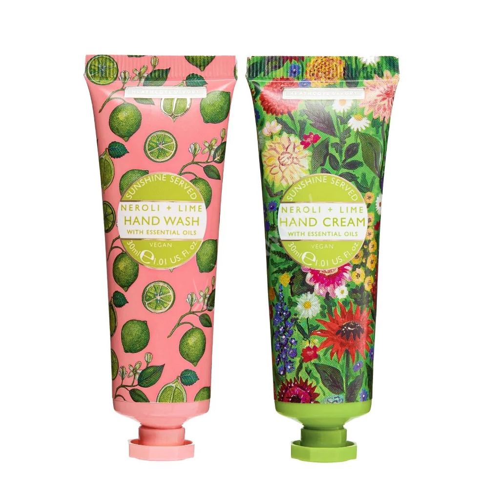 Elegantní kosmetická taštička na zip s květovaným potiskem v sobě ukrývá praktické produkty péče o ruce. Sada obsahuje tekuté mýdlo na ruce a krém na ruce provoněné esenciálními oleji z neroli, citronu a mandarinky, doplněné vůní limetky.