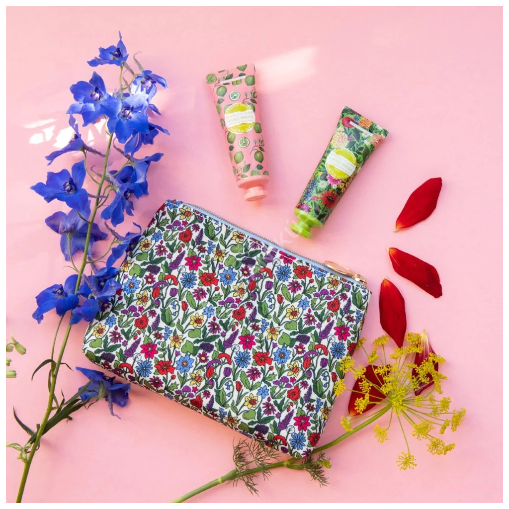 Kosmetická taštička na zip s květovaným potiskem v sobě ukrývá praktické produkty péče o ruce.
