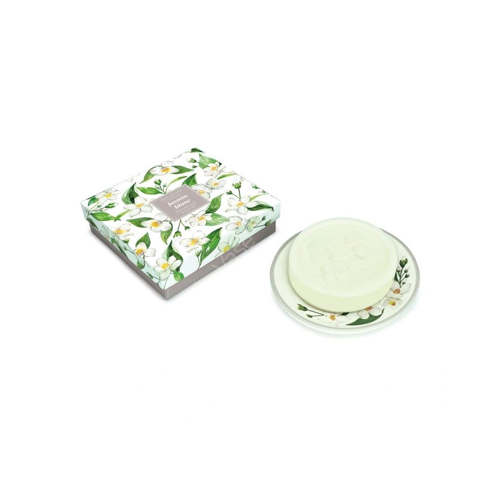 Luxusní dárková sada obsahuje tuhé mýdlo s jemnou vůní jasmínu a podložku na mýdlo s motivem jasmínu. Kvalitní mýdlo s přírodním složením hydratuje pokožku a zanechává ji hebkou a hladkou na dotek. Mýdlo je obohaceno o olivový olej a organické bambucké máslo.