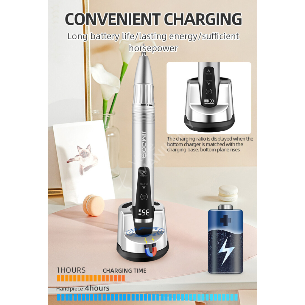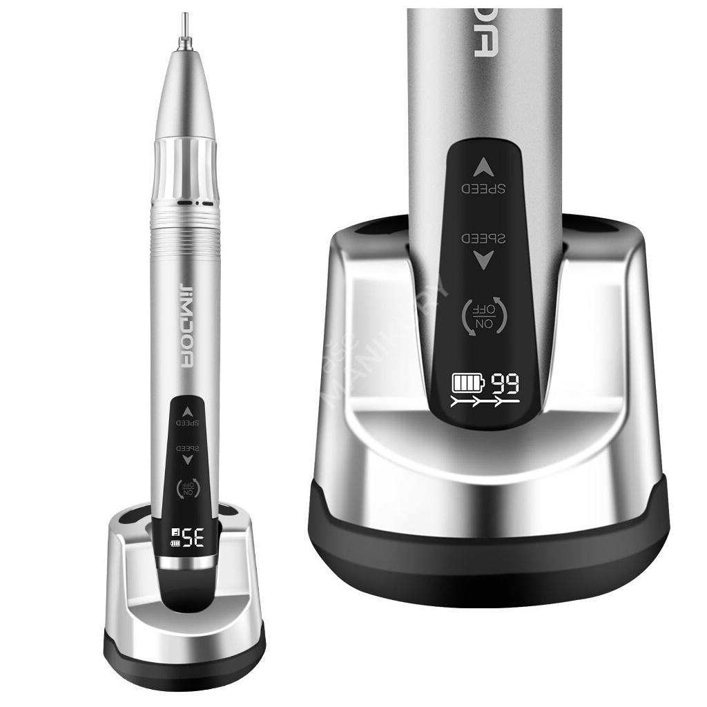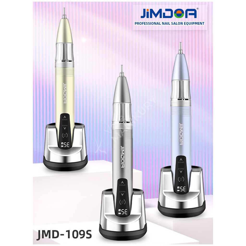 Příjemná, ergonomicky tvarovaná bruska JMD-109S s dobíjecí základnou. Bruska se snadno ovládá i používá a poskytuje při práci potřebný komfort usnadňující její pravidelné používání. Nejvyšší dosažitelná provozní rychlost je 35 tis. ot./min. Optimální příkon magnetické základny pro nabíjení je 15 W. Bruska je navržena pro pravidelný provoz a s cílem dosáhnout vysokého výkonu při klasických operacích spojených s péčí o nehty, jako jsou broušení či leštění.