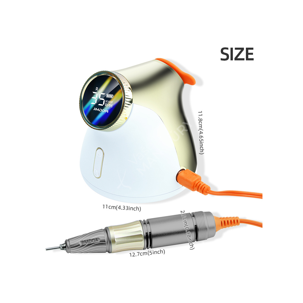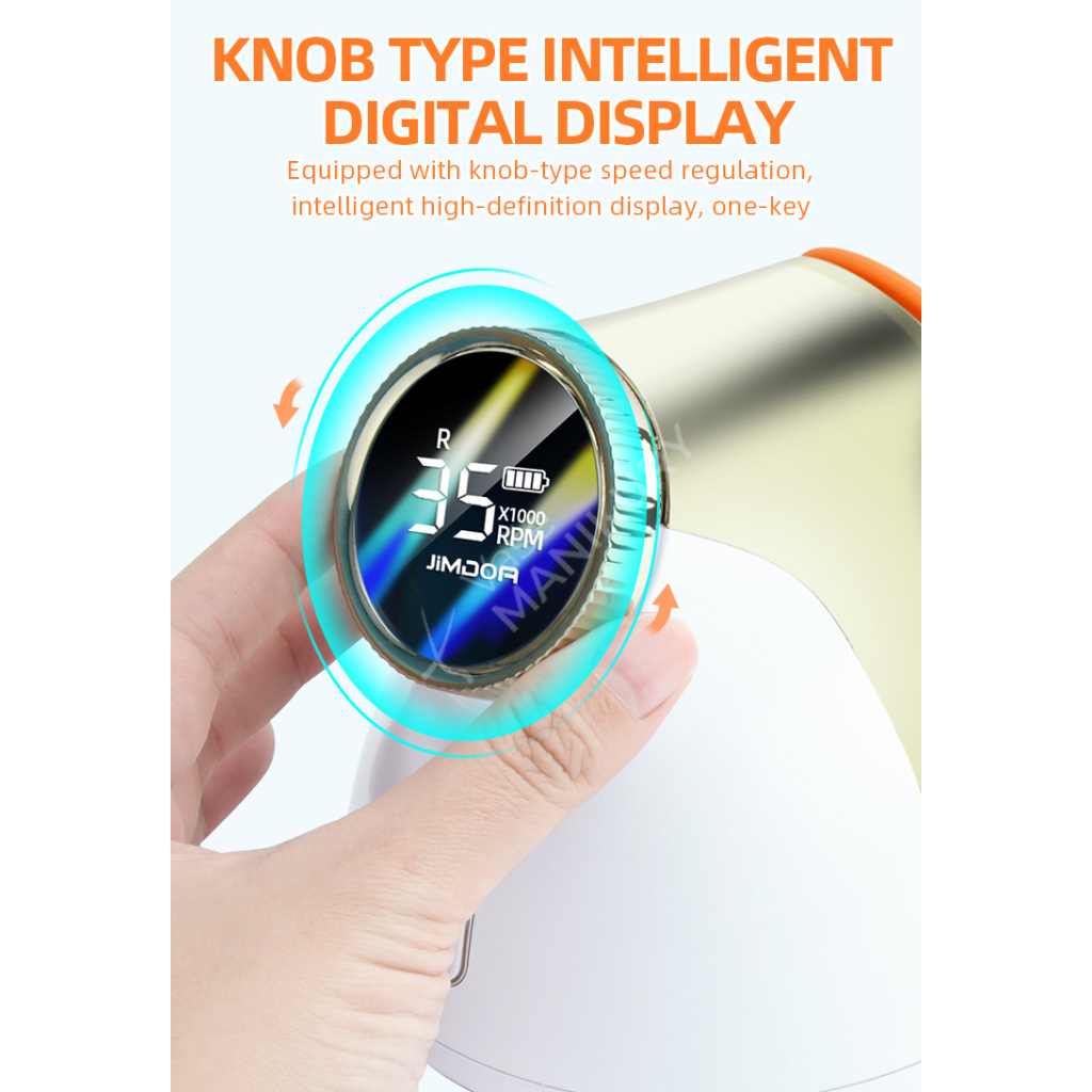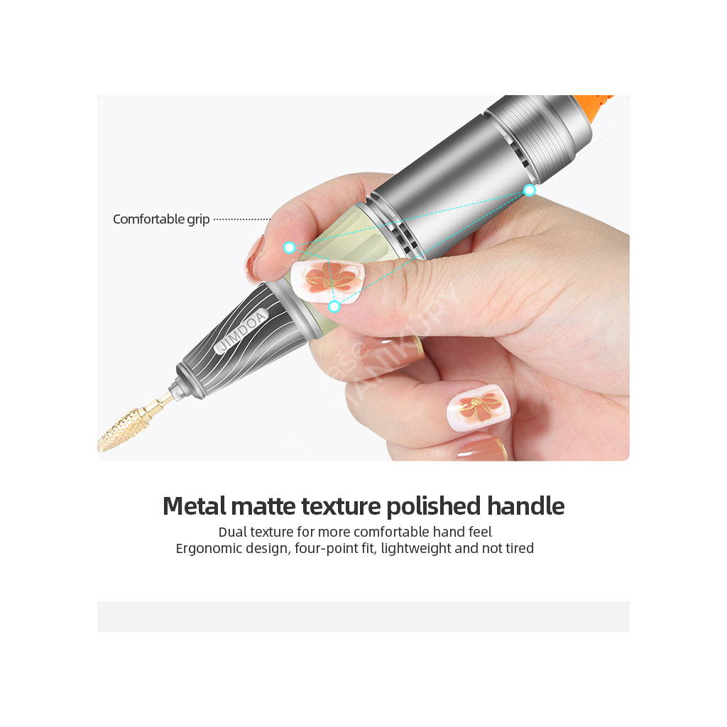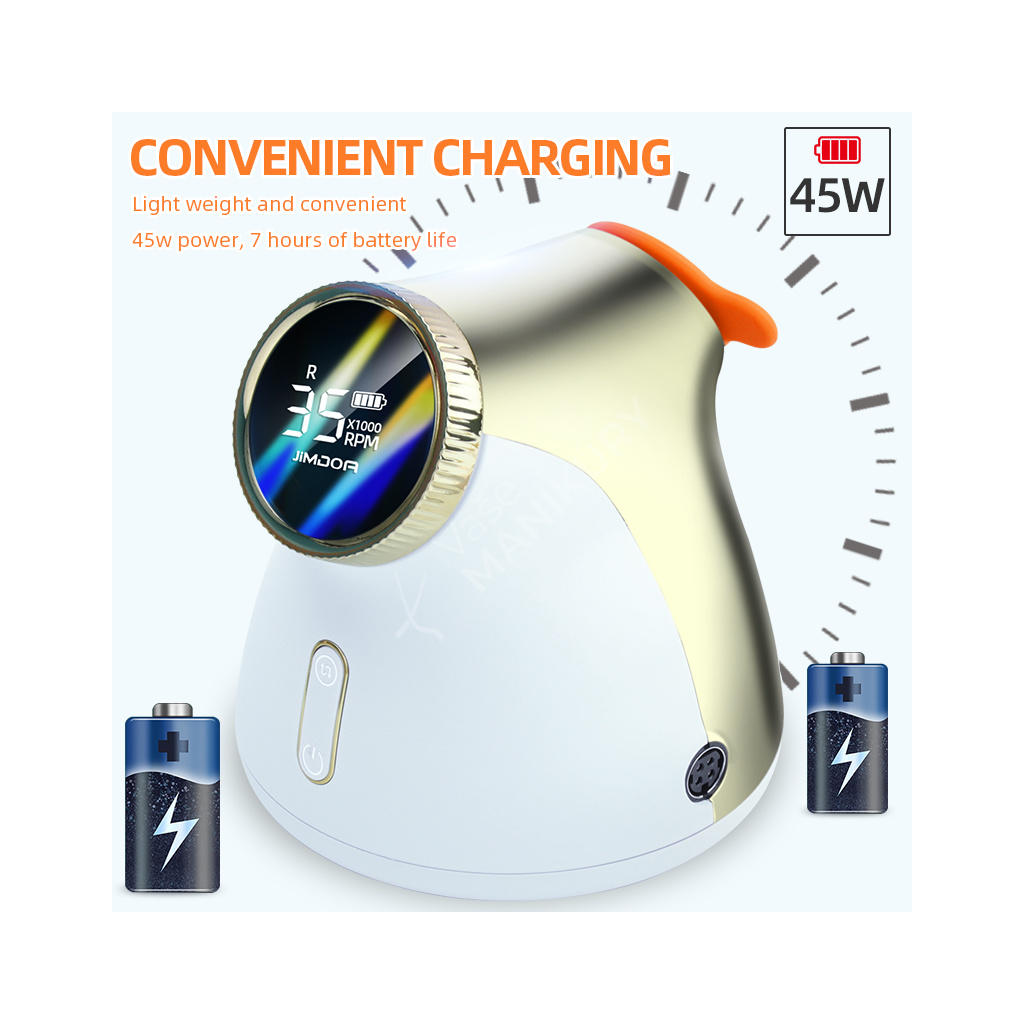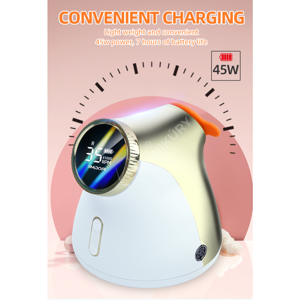 Akumulátorová bruska na nehty JMD-E101P je navržená ve velmi unikátním designu se snadným ovládáním rychlosti a velkokapacitní baterií. Bruska JMD-E101P patří mezi produkty, které budou ozdobou vašeho pracovního stolu. Bruska je velmi kompaktní, s atraktivním designem a velmi intuitivním ovládáním. Brusný nástroj dosahuje rychlosti až 35 tis. ot./min, kterou lze nastavit kontinuálně prostřednictvím otočného regulátoru.Tuto brusku si oblíbíte nejen pro její snadné použití a funkční řešení, ale také pro poutavý design s řadou velmi atraktivních detailů.