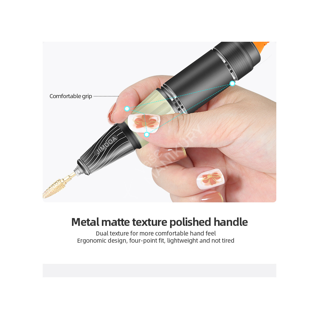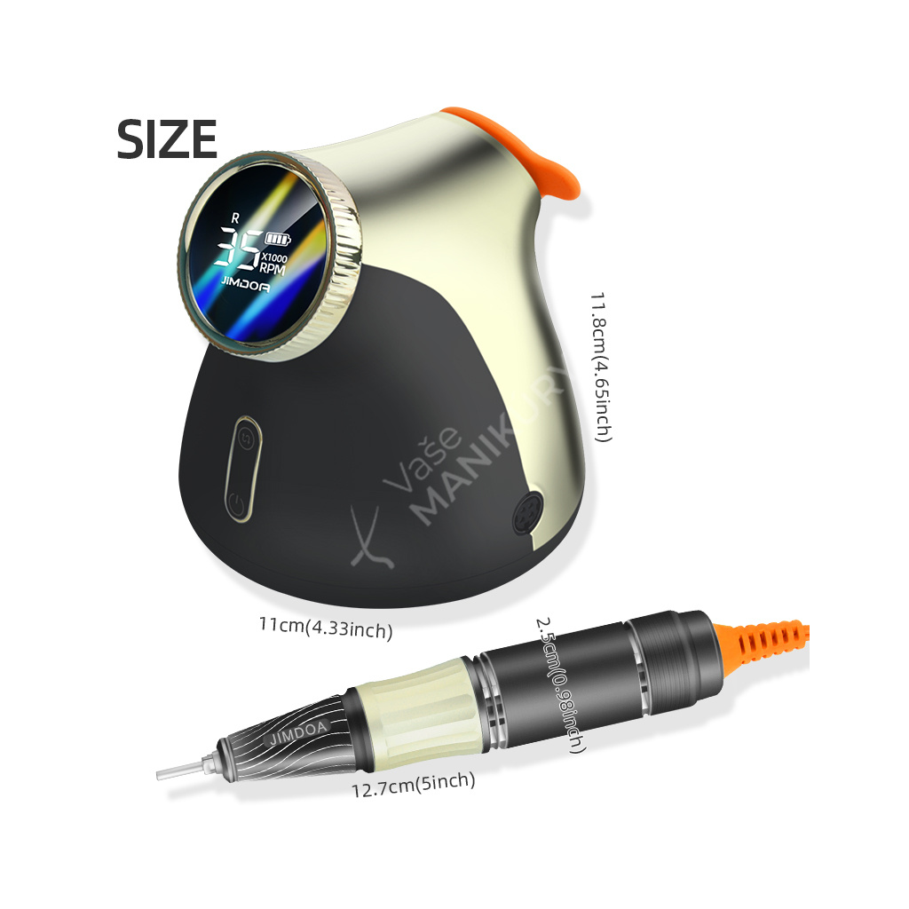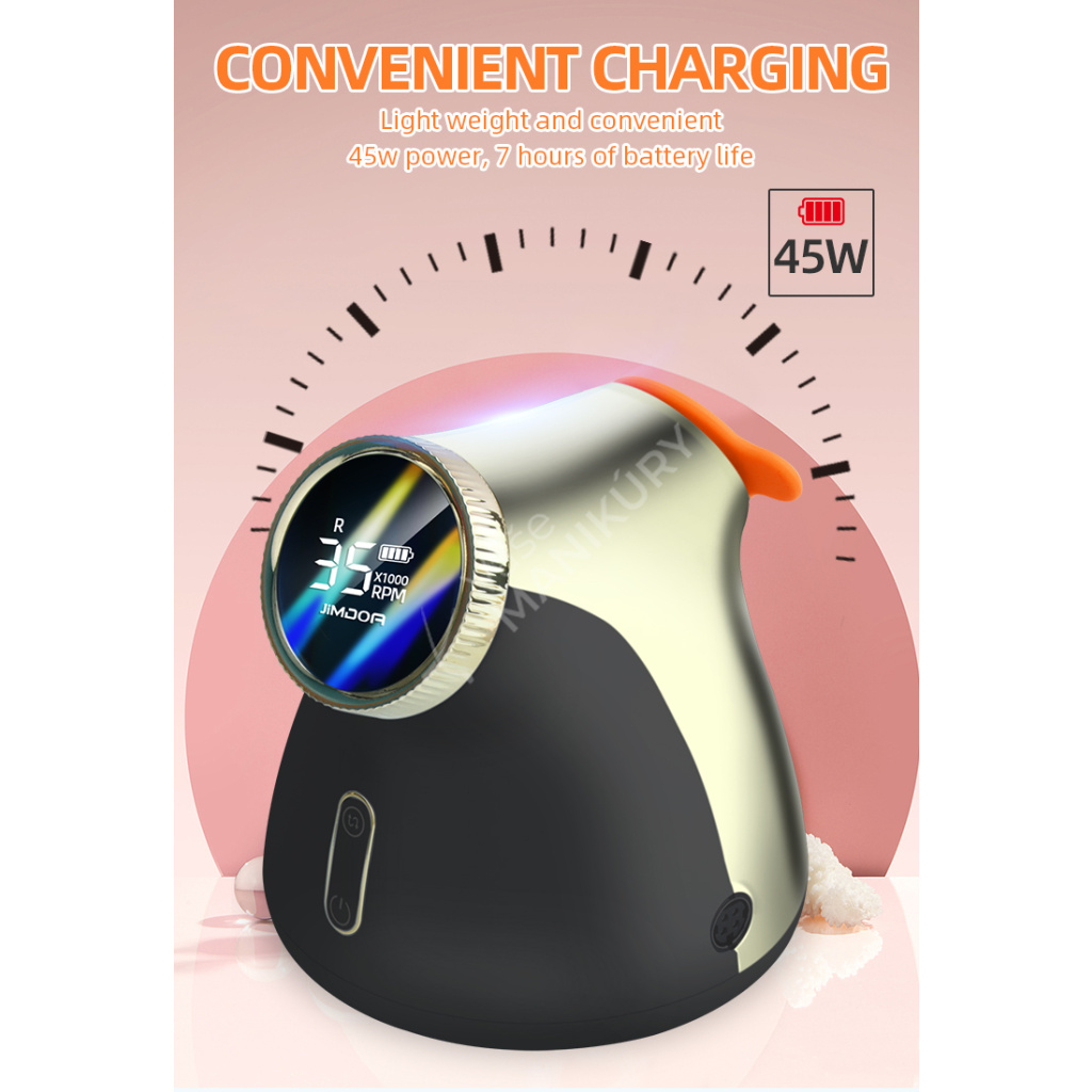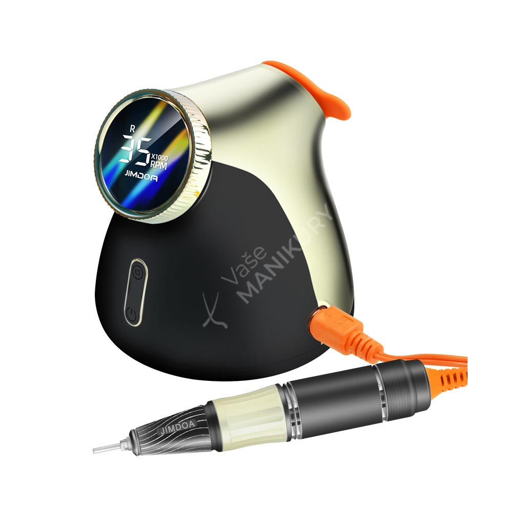 Akumulátorová bruska na nehty JMD-E101P je navržená ve velmi unikátním designu se snadným ovládáním rychlosti a velkokapacitní baterií. Bruska JMD-E101P patří mezi produkty, které budou ozdobou vašeho pracovního stolu. Bruska je velmi kompaktní, s atraktivním designem a velmi intuitivním ovládáním. Brusný nástroj dosahuje rychlosti až 35 tis. ot./min, kterou lze nastavit kontinuálně prostřednictvím otočného regulátoru.Tuto brusku si oblíbíte nejen pro její snadné použití a funkční řešení, ale také pro poutavý design s řadou velmi atraktivních detailů.