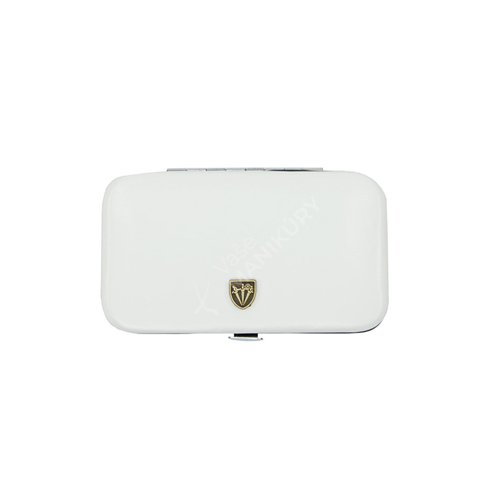 Bílé pevné pouzdro s kovovým rámem je vyrobeno ze syntetické kůže s lesklou úpravou. Jednoduchý a elegantní design pouzdra v kombinaci s kvalitními manikúrními nástroji z něj díky své velikosti činí ideálního společníka na cesty. Černé nástroje s bílým pouzdrem vytváří efektní barevný kontrast.