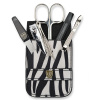 Manikúra je vybavena nástroji z kvalitní poniklované oceli od německého výrobce Kellermann. Nástroje jsou uloženy v pouzdru ze syntetické kůže s hravým černobílým motivem zebry.