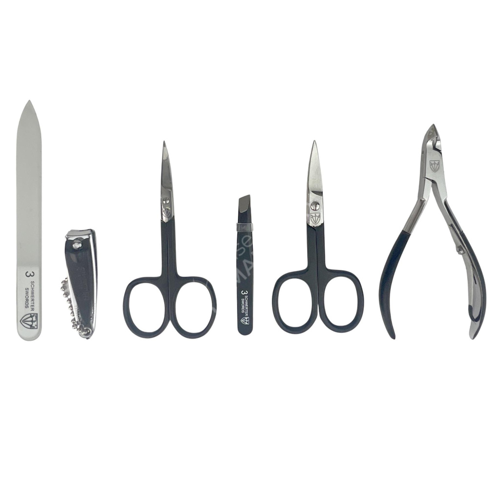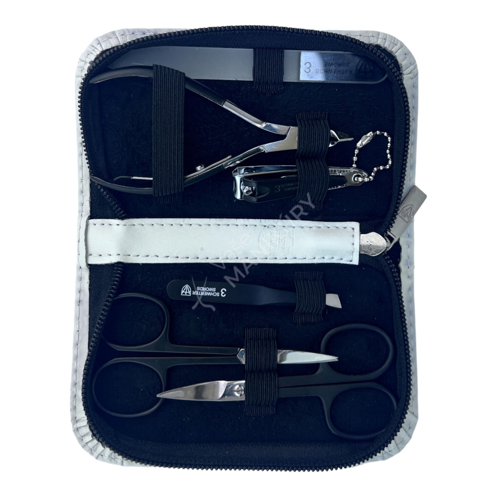 Manikúra je vybavena nástroji z kvalitní poniklované oceli od německého výrobce Kellermann. Nástroje jsou uloženy v bílém koženém pouzdru se zavíráním na zip.Černé nástroje s bílým podkladem pouzdra vytváří efektní barevný kontrast. Látka na vnitřní straně pouzdra je na povrchu sametová, jemná a velmi příjemná na dotek.