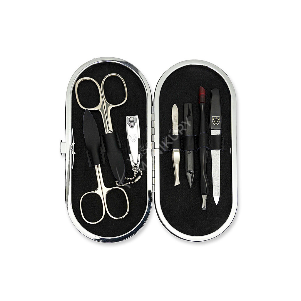 Velmi kvalitní 7dílná sada na manikúru přehledně uložena v pouzdru z pravé kůže s kovovým rámem.
