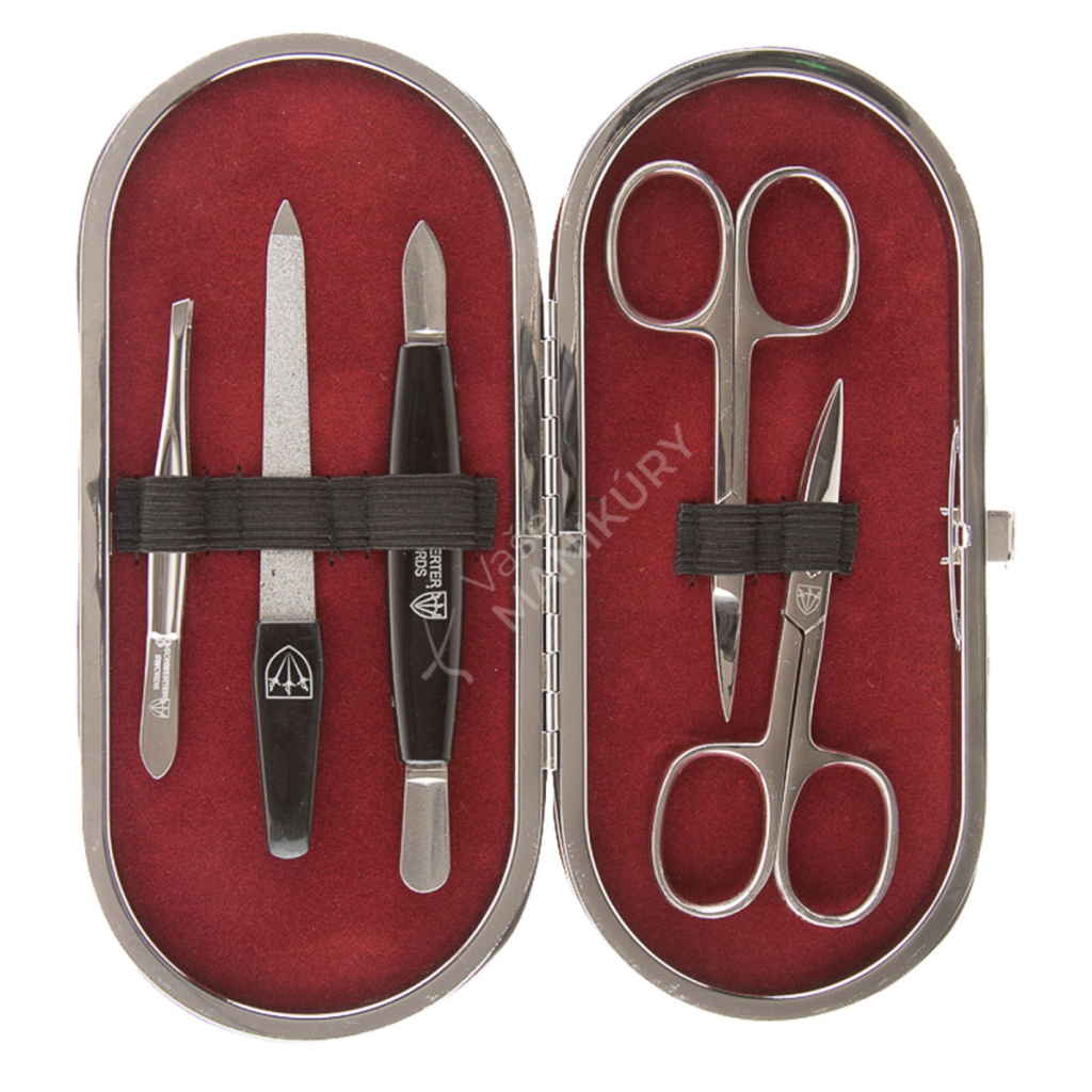 Sada na manikúru obsahuje pět pečlivě vyrobených nástrojů z kvalitní poniklované oceli od německého výrobce Kellermann.
