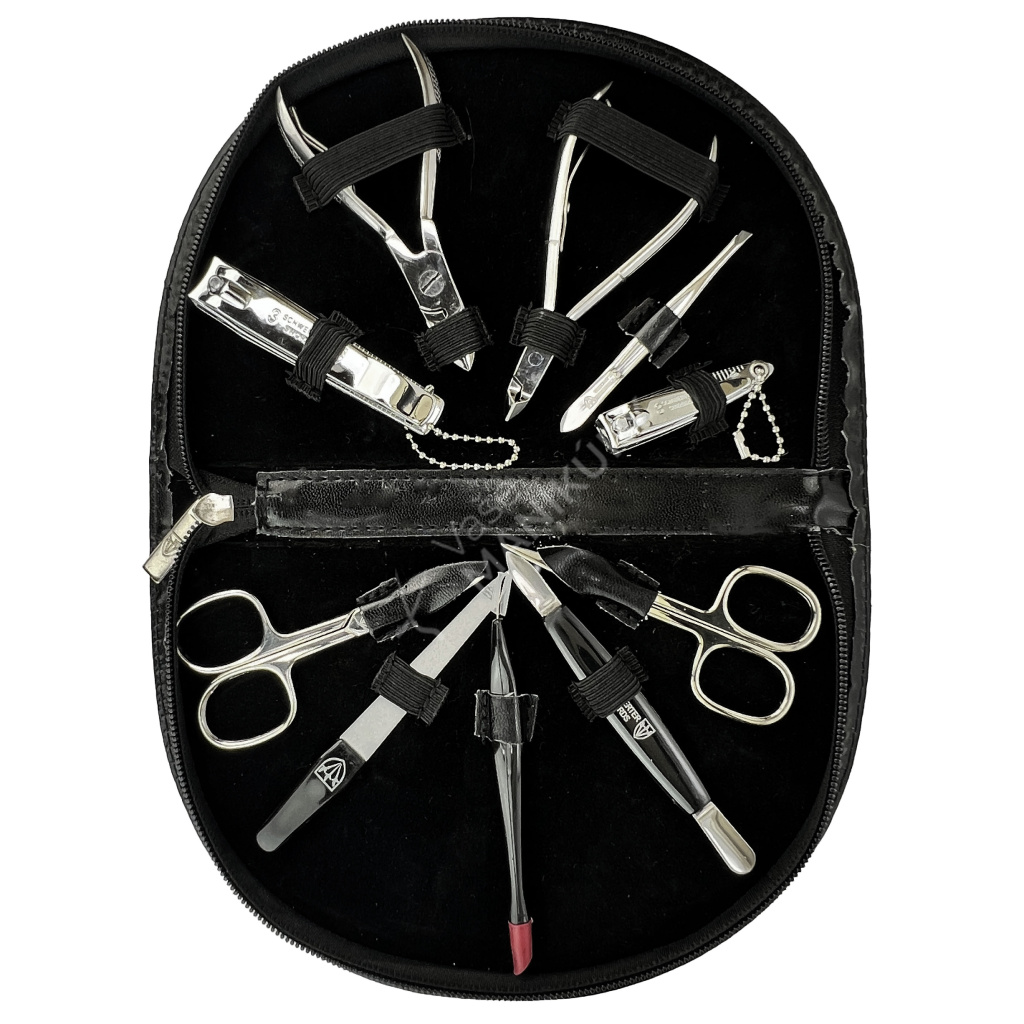 10dílná sada je vybavena nástroji z kvalitní poniklované oceli od německého výrobce Kellermann. Nástroje jsou uloženy v černém pouzdru ze syntetické kůže s hladkou povrchovou úpravou a zavíráním na zip. Látka na vnitřní straně pouzdra je na povrchu sametová, jemná a velmi příjemná na dotek. Pouzdro je také zajímavé svým nevšedním půlkruhovým tvarem.