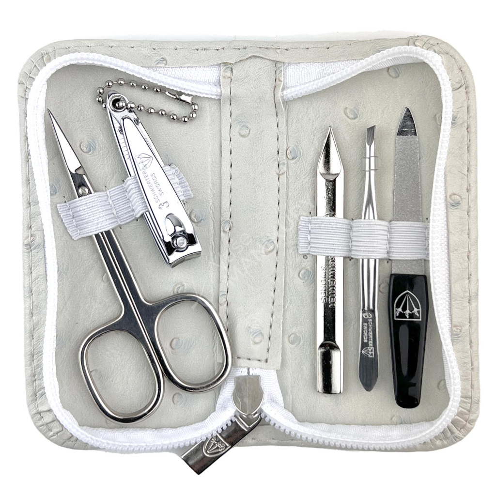 Manikúra je vybavena nástroji z kvalitní poniklované oceli od německého výrobce Kellermann. Nástroje jsou uloženy v béžovém pouzdru s nádechem do modra. Pouzdro ze syntetické kůže se zavíráním na zip je upraveno do vzhledu pštrosí kůže.