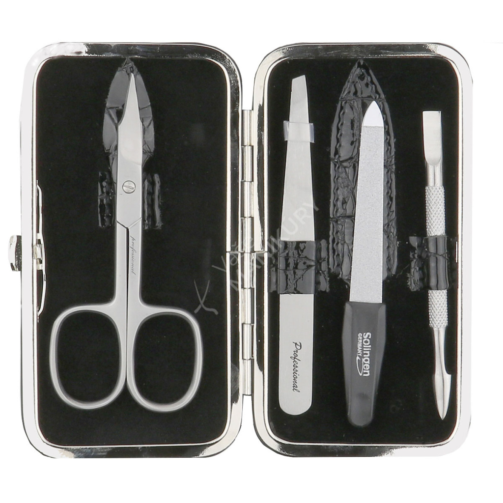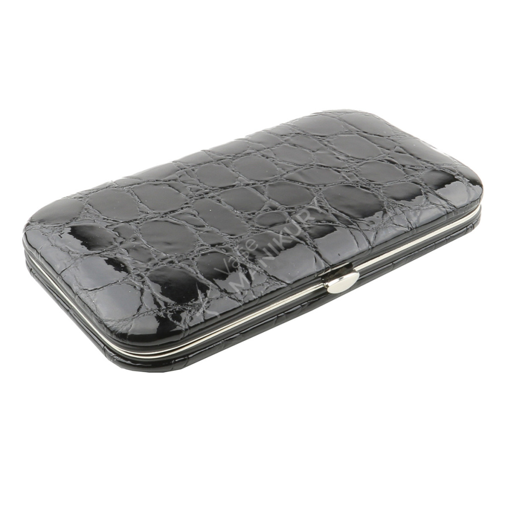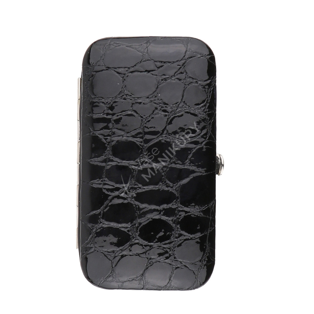 Černé pevné pouzdro s kovovým rámem je vyrobeno z pravé kůže s designem krokodýlí kůže s lesklou úpravou. Látka na vnitřní straně pouzdra je na povrchu sametová, jemná a velmi příjemná na dotek. Jednoduchý a elegantní design pouzdra v kombinaci s kvalitními manikúrními nástroji z něj díky své velikosti činí ideálního společníka na cesty.