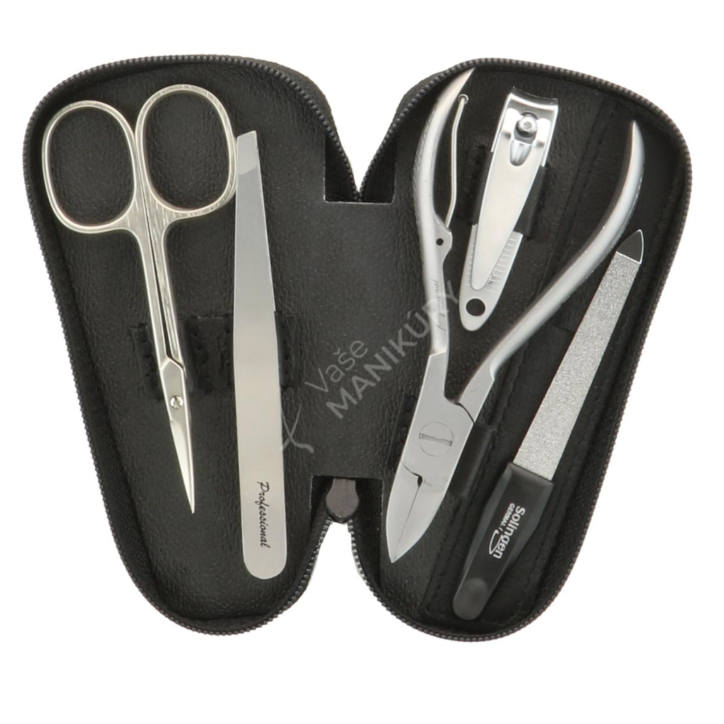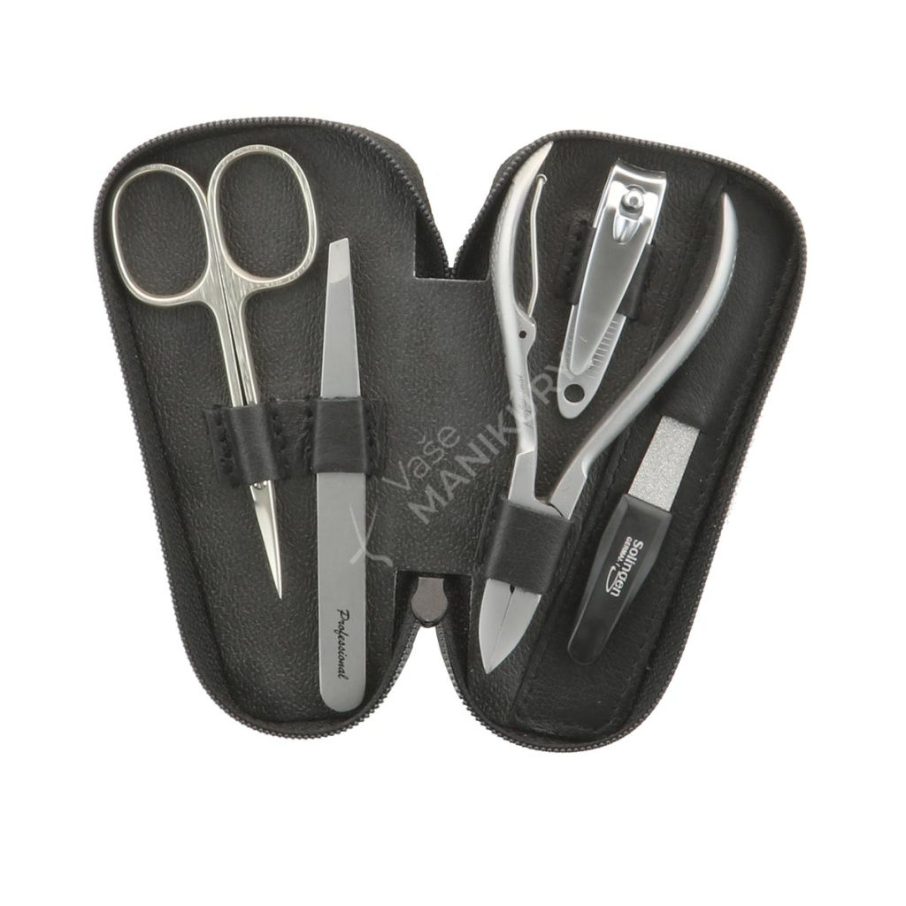 - Pánská sada na manikúru v koženém pouzdře – Obsahuje nůžky na kůžičku, kleště na nehty, safírový pilník, šikmou pinzetu a malé kleštičky na nehty. Všechny nástroje jsou vyrobeny z nerezové oceli a jsou uloženy v elegantním černém pouzdře z přírodní hovězí kůže, které se uzavírá na zip. Ideální na cesty a skvělý dárek.