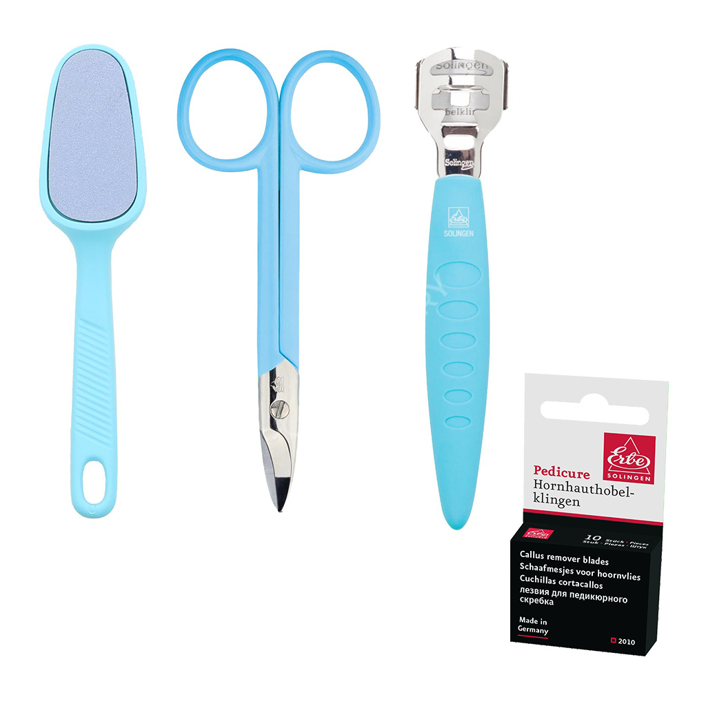 Výhodný vánoční balíček modrých pedikúrních nástrojů Erbe Solingen pro dokonalou péči o chodidla.