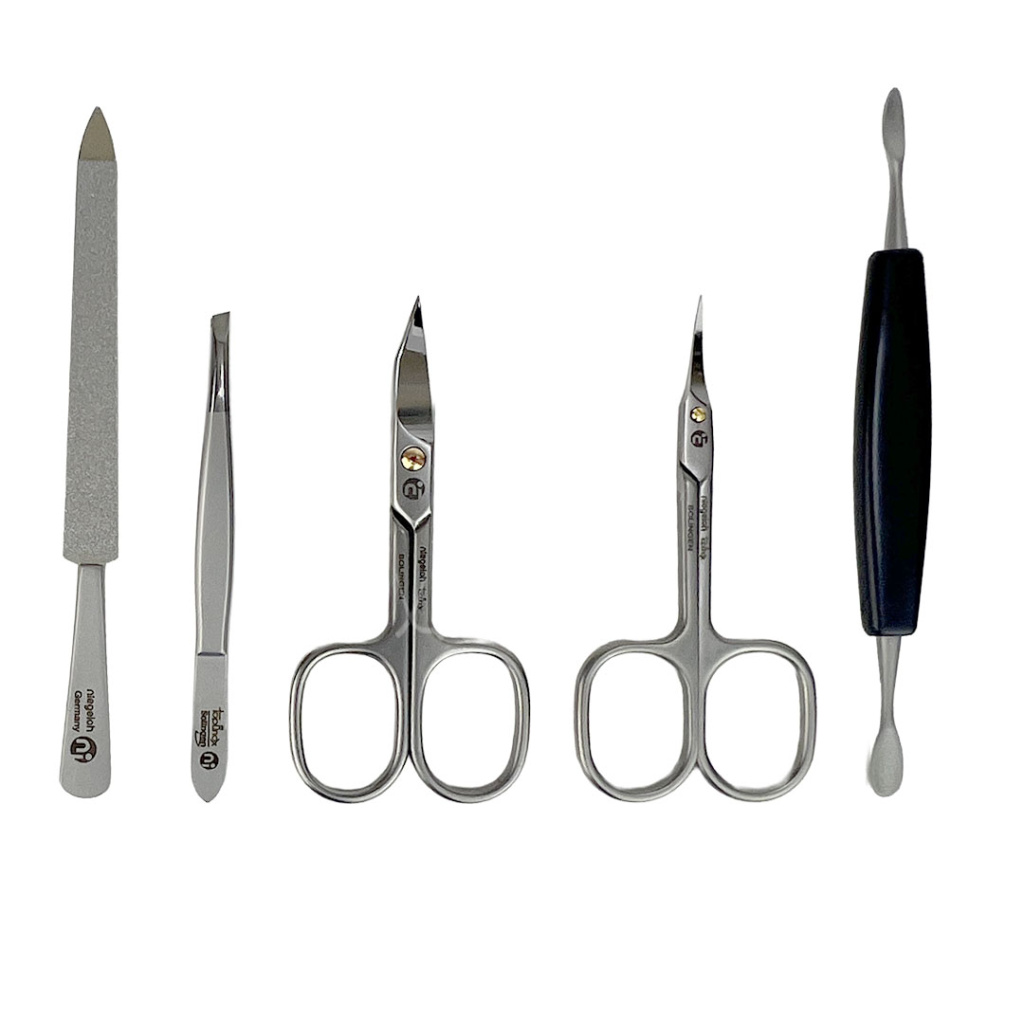 Uvnitř manikúry najdete 5 nejdůležitějších nástrojů na úpravu nehtů. Nůžky a pinzeta jsou vyrobeny ze speciálně temperované nerezové oceli řady TopInox® ( ocel DIN 1.4034) známé také jako chirurgická ocel. Tato ocel je bez niklu, antialergická a sterilizovatelná. Nástroje jsou odolné vůči korozi a zůstávají neuvěřitelně dlouho ostré. Při výrobě se používají nejnovější technické postupy. Všechny nůžky Niegeloh se precizně ručně seřizují a jsou podrobeny kontrole kvality.
