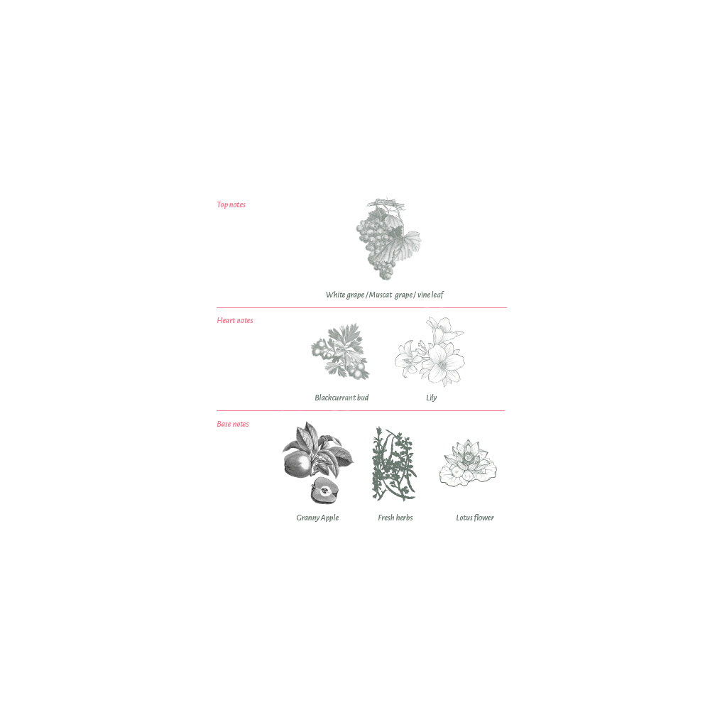 - jedinečná svěží vůně bílého hroznového vína obohacena o jemné tóny šeříku,černého rybízu, lotosu a čerstvých bylinek