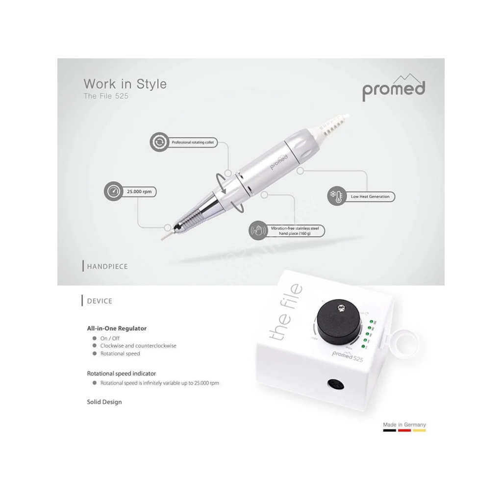 Elektrická bruska PROMED 525 je určena především pro péči o nehty na rukou, nehtový design a jemnou pedikúru. Lze ji považovat za optimální vybavení pro začínající manikérky nebo na domácí použití. Jednoduchý design a vysoký výkon ji předurčují k častému použití.