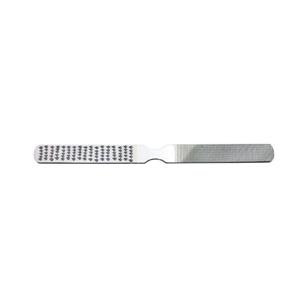 Tato oboustranná celokovová rašple slouží k odstranění zrohovatělé kůže na patách. Celková délka rašple je 15,5 cm. Uprostřed je zúžená, což přispívá ke snadnějšímu uchopení a stabilnější manipulaci s nástrojem.Doplňkové parametry