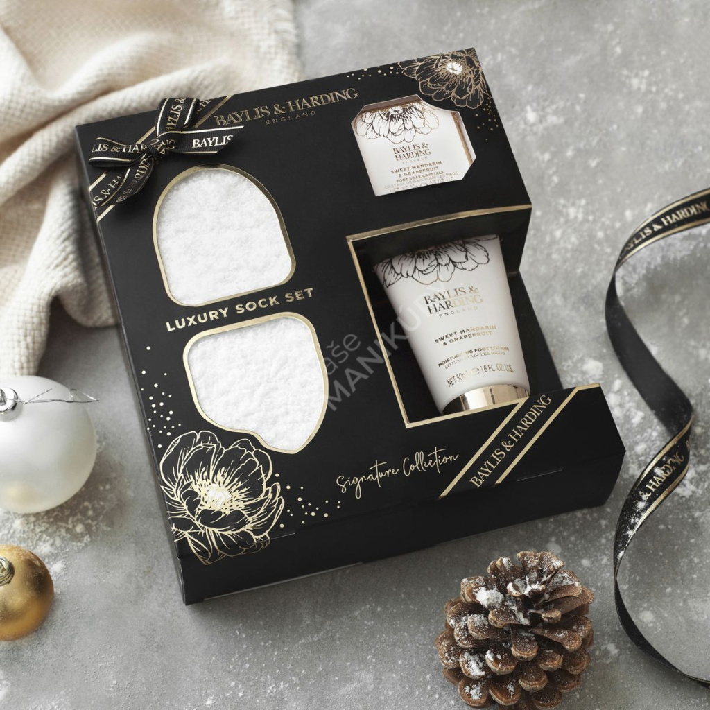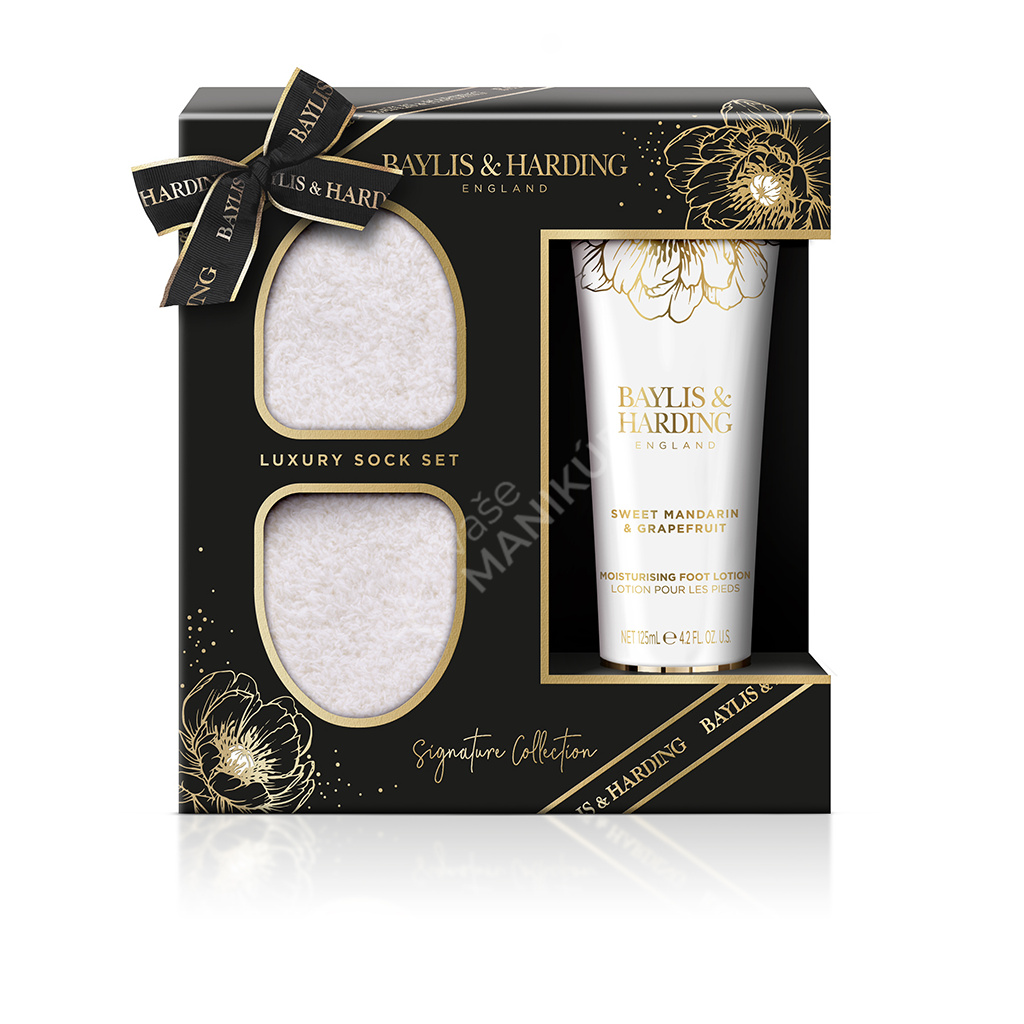Luxusní dárkový set péče o nohy Baylis & Harding obsahuje hydratační mléko a ponožky. Dopřejte si luxusní pedikúru.