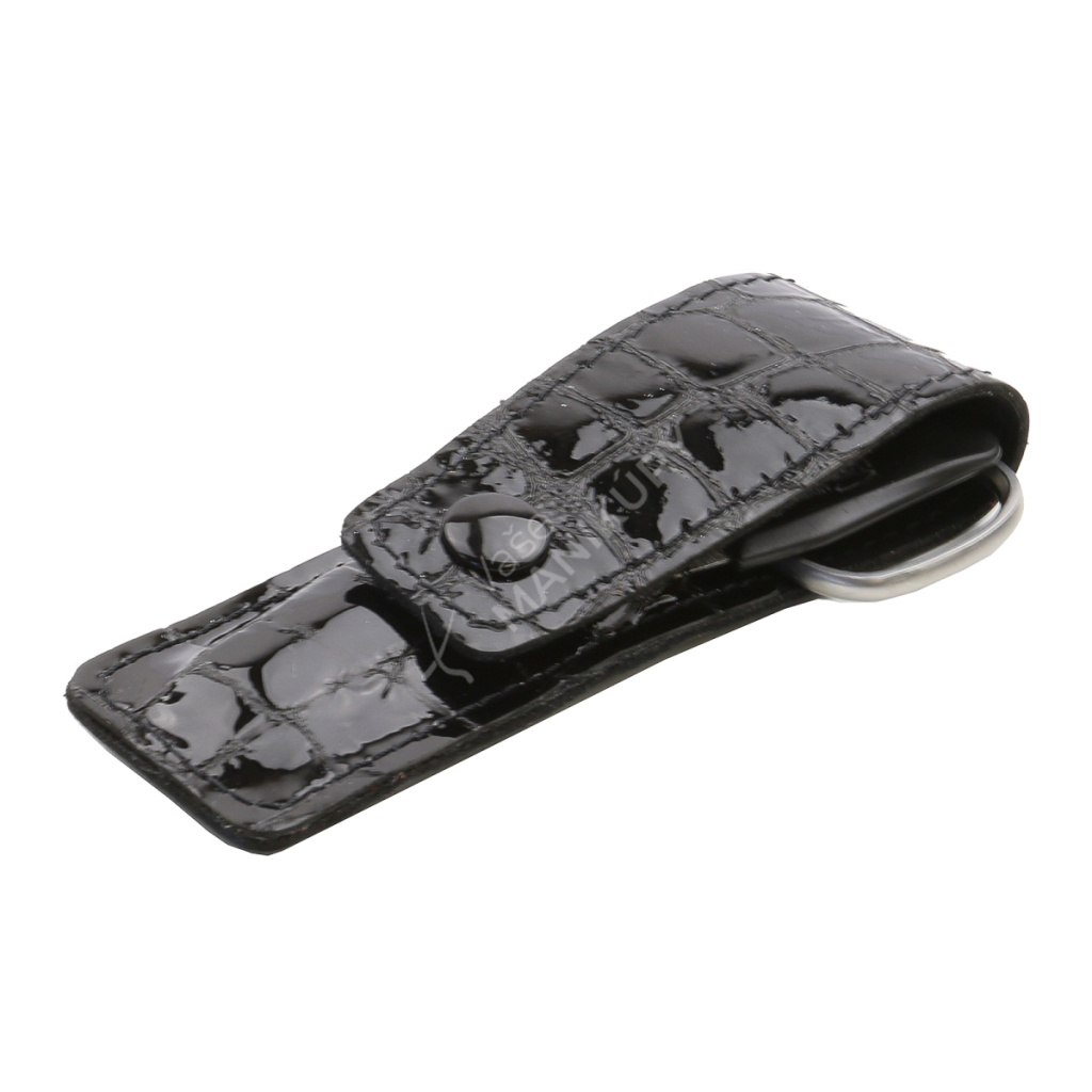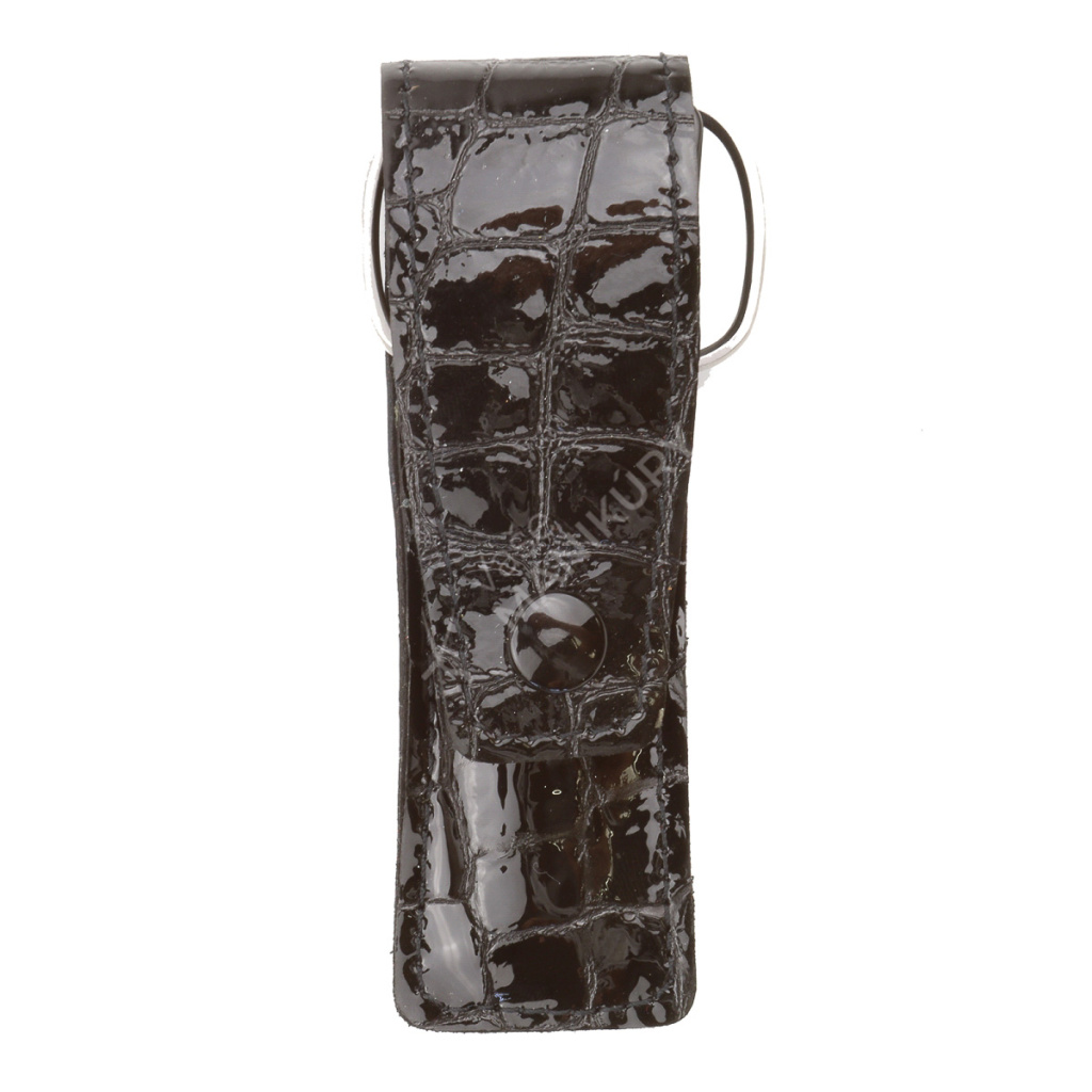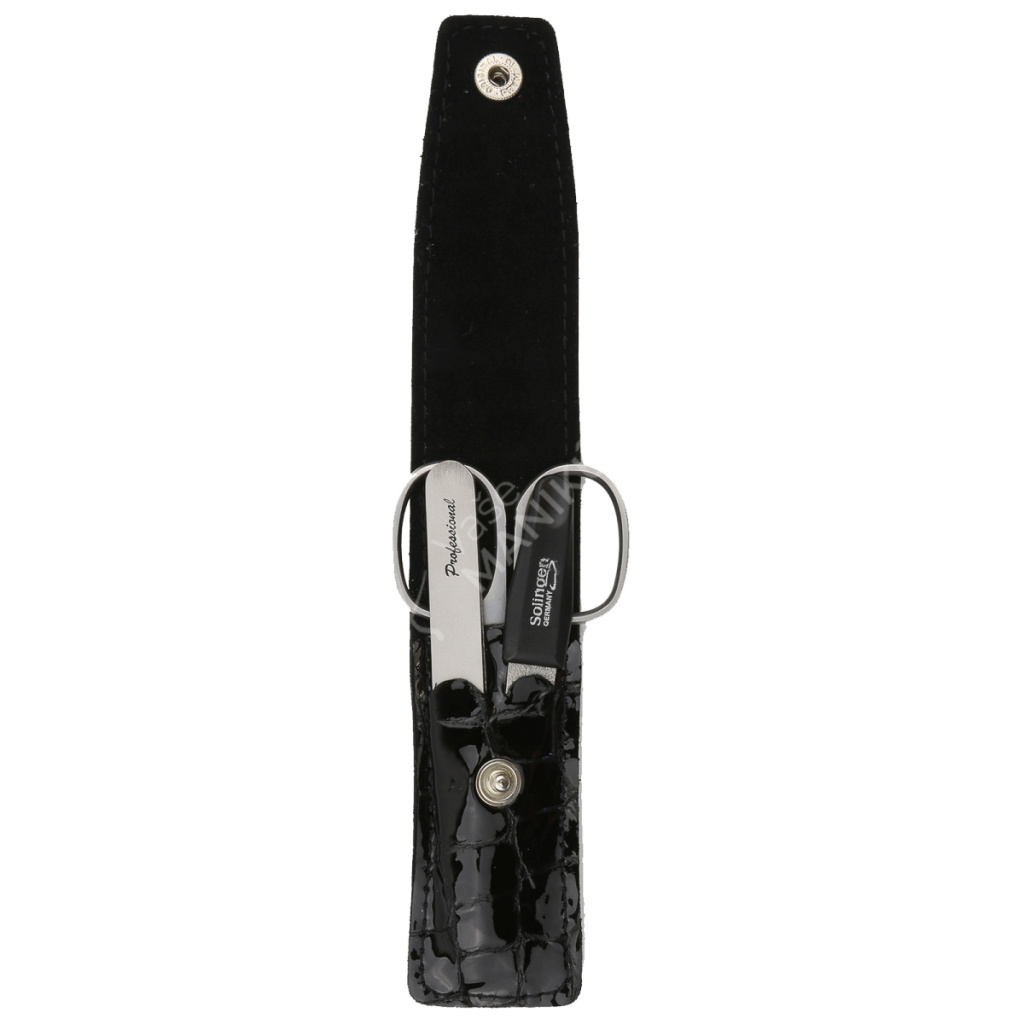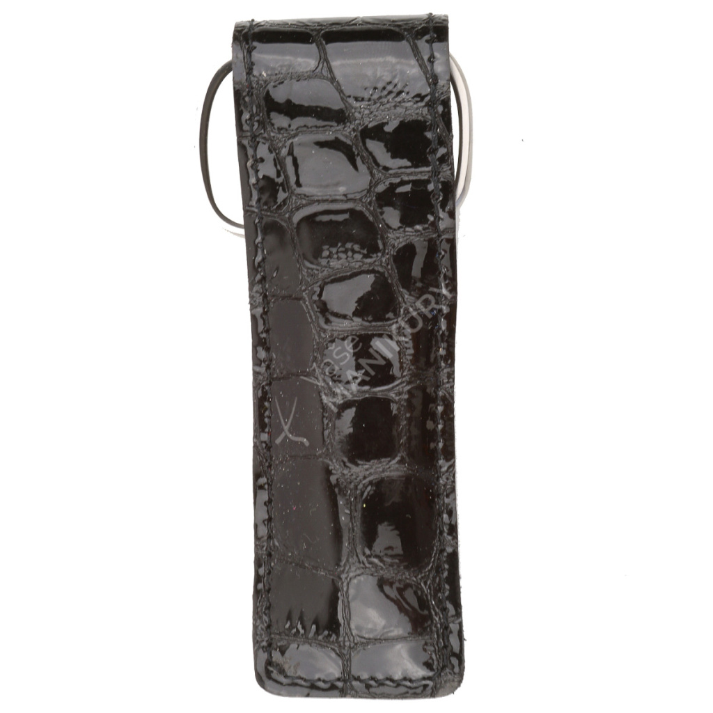 Malý a praktický set na manikúru v černém pouzdru z přírodní hovězí kůže s designem krokodýlí kůže. Pouzdro se uzavírá na klopnu.