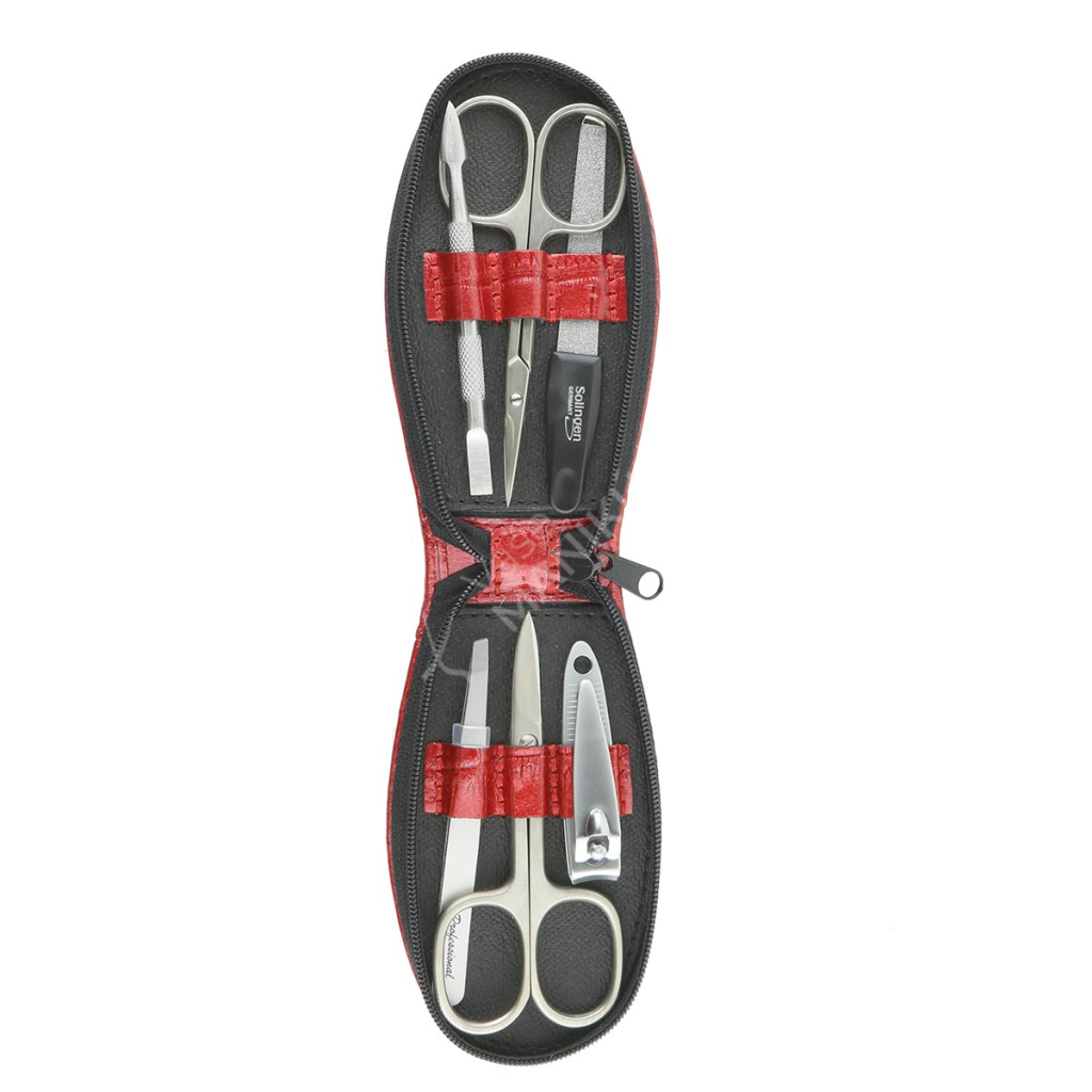 Malá červená manikúra pro ženy z pravé kůže s nůžkami a pilníkem Solingen. Ideální do kabelky a cestování.